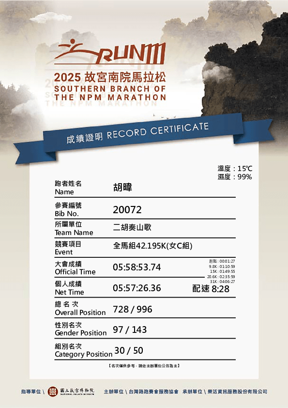 結果成功六個鐘內完成,gun time 5:58:53.74,chip time 5:57:26.36,排名又未至於太差,7個鐘限時嘅全馬賽事,容許大家慢啲都得,總名次728/996,性別名次97/143,組別名次30/50,下次有好大進步空間~