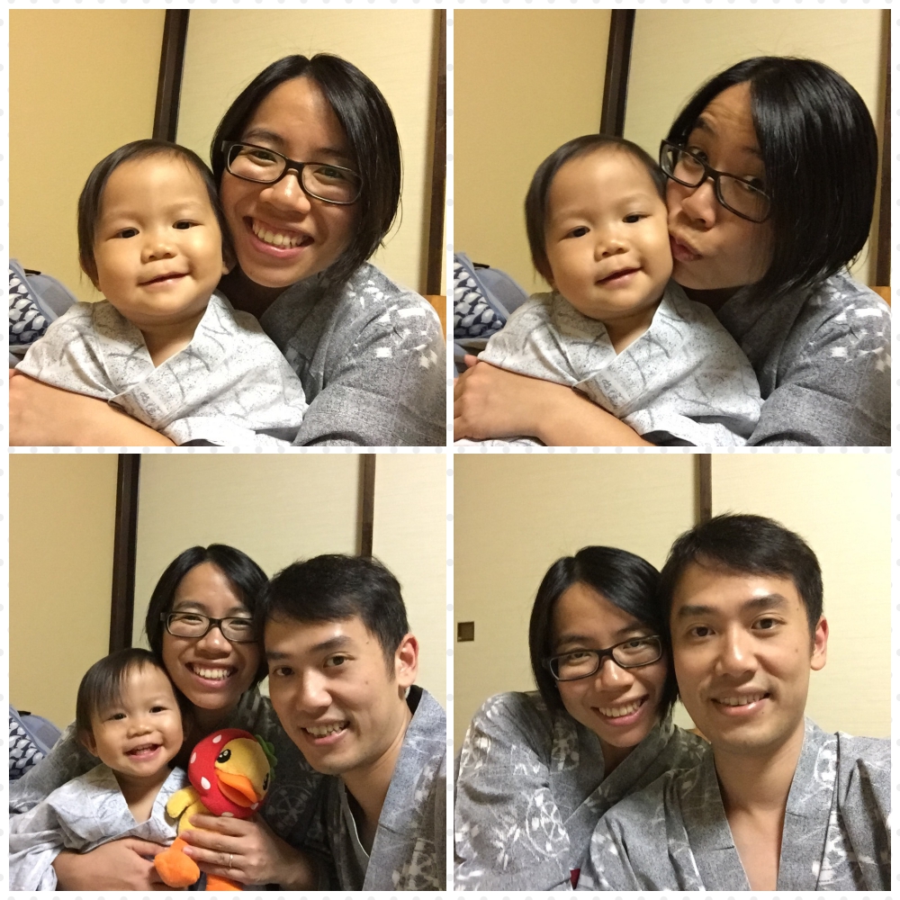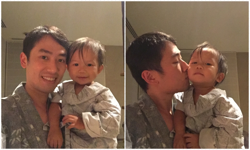 食飽飽返房休息一陣又到另一重頭項目,當然係浸溫泉啦﹗其實有啲緊張嘅係,今次係第一次帶曉去大浴場沖涼,因為房間入面係冇浴室的,曉即使唔浸都一定要落去沖涼,一來曉沖慣浴盆對花灑有少少驚,二來去到陌生環境唔知會點,我都要鼓起勇氣﹗好在我哋沖涼時客人唔多,有咩發生都唔怕太尷尬~更衣室好大好乾淨好舒服,我同曉曉都脫光光就入去沖涼,可能因為係陌生環境佢真係緊張吧,企定定唔會走嚟走去,我唱住歌同佢沖都好合作,順利完成﹗雖然都估佢會怕熱唔肯浸溫泉,都即管一試下,放一隻腳入去時就話熱熱,跟住想出去,ok,咁都係照我原本嘅計劃進行啫~更衣室嗰度好貼心咁有張bb床,我先放曉入去等我,我可以鋪大毛巾係地上同佢抹身著尿片,曉曉件小童浴衣雖然有啲oversize,但都超可愛丫~輕鬆搞掂就輪到我私人時間啦,爸爸同曉曉去玩,我入番去浸咯~內湯都有兩個池加蒸氣浴,我樣樣都試下咁啦,當然都要試埋外湯,心のリゾート 海の別邸當初最吸引我想入住嘅就係景觀似infinity pool嘅外湯,umum⋯因為打風嘅關係,同我expectation有好大差距,出去一陣我就要入番嚟了,因為大風大雨大浪得太恐怖了,雖然有簷蓬唔會淋濕,但視覺同聽覺效果都令人覺得有威脅,好怕有咩事都冇人知,都係出去啦,驚驚~