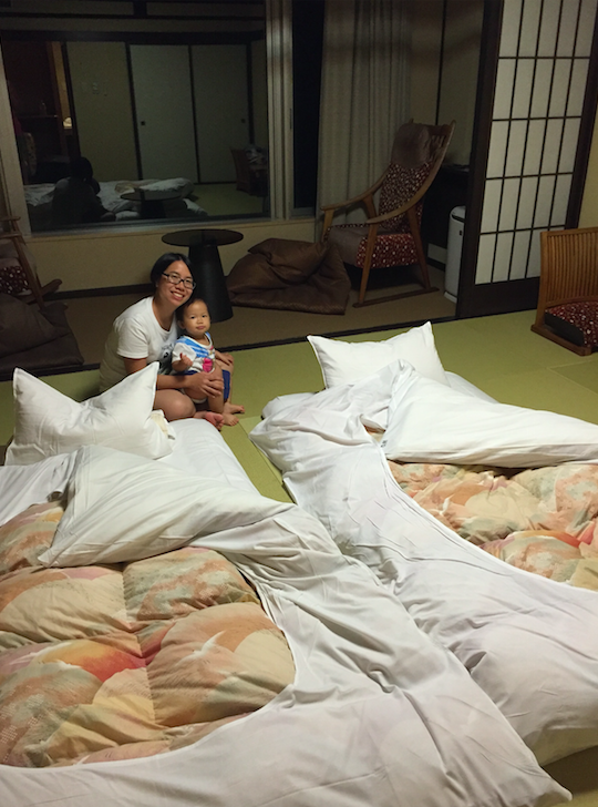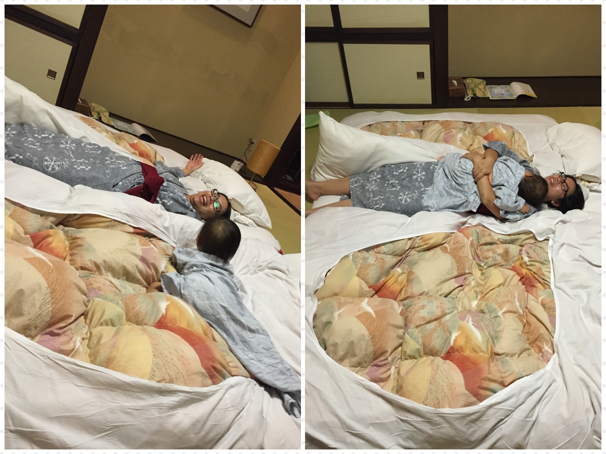 我哋返到房時,榻榻米上面已經鋪到床鋪啦~