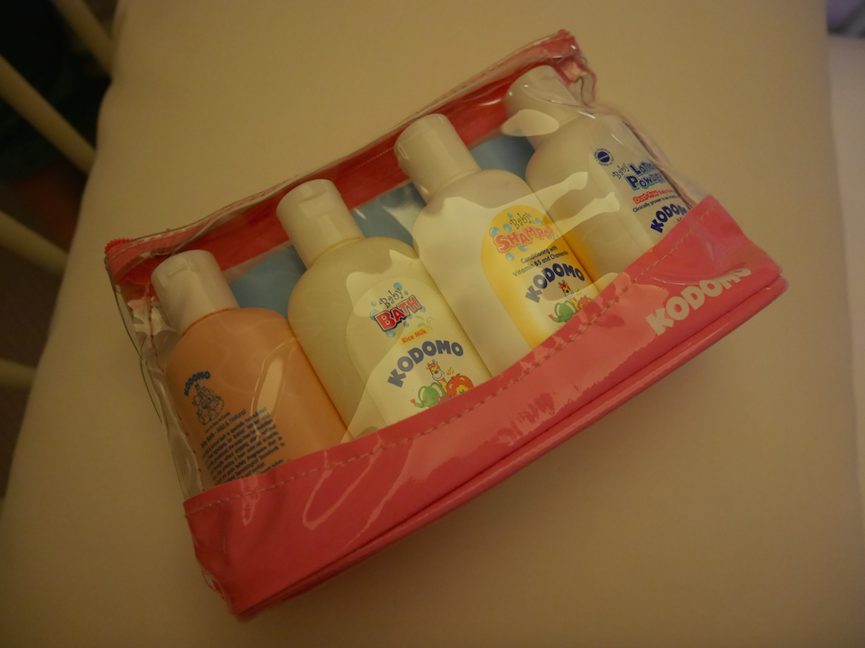 贈送嘅bb沐浴用品我哋就帶咗返嚟,用就未試用,暫時變成曉嘅玩具,最鍾意開關拉鍊,又放嘢入去又拎出嚟咁,再扮倒倒倒啲樽嚟搽下面咁~