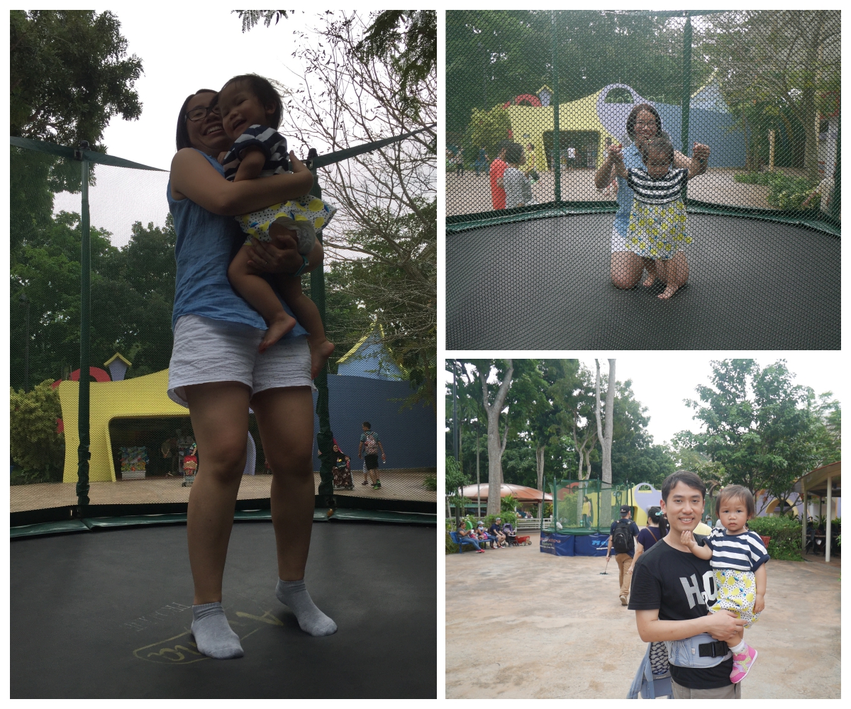 估唔到嘅係,佢主動想玩嘅係跳彈床﹗﹗因為最近好喜歡Peppa Pig,Peppa同佢屋企人、唱遊班嘅動物小朋友個個都好鍾意係泥氹上跳上跳落、跳上跳落,曉就學識咗「跳上跳落」呢個term,佢見到小朋友係彈床度玩就指住話「跳上跳落」,問佢想唔想玩就話想了,眼神非常熱切呢,好啦,S$5/10分鐘,排隊時見我入埋去的話體重都冇超標,問准工作人員,我都可以俾錢入去一齊跳,梗係好啦,可以照顧住佢嘛﹗出發去旅行前嗰幾日,曉去海洋公園嘅吹氣彈床玩得好開心,諗住呢個真彈床都ok,點知入到去原來太刺激~佢唔識自己跳,但我跳嘅時候彈起佢佢又驚驚,唯一ok嘅係我抱住佢嚟跳,本身跳彈床以經要好用力,跑住廿幾磅嚟跳真係捱唔到幾耐,放低佢休息一陣,曉直情話要出去,吓?俾咗錢唔好浪費啦,我其實真係好鍾意跳彈床,哈哈,令人回味當年中學上PE堂嘅日子,我都跳得幾好㗎~但當見到有小朋友係度排隊,望住我呢個大嬸一條友係度跳彈床,件事實在太奇怪了,問咗曉曉真係唔想再入番去玩,我決定提早出嚟啦,唔好阻住其他小朋友了,呢件事實在太搞笑~