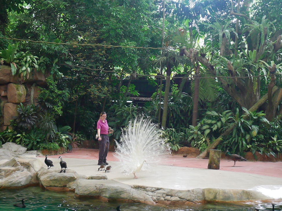 而成個show最令人歎為觀止嘅係closing時啲雀鳥出嚟嘅部份,孔雀見過好多次,係印度時連野生孔雀都見過,但孔雀開屏真係未見過,今次迅雷不及掩耳,毫無預兆之下,白色孔雀開屏了﹗﹗大家都「哇~」晒出聲,但令人感到傷感嘅係另外一隻彩色孔雀完全唔show嗰隻開屏孔雀,而開屏嘅白色孔雀一而再再而三咁登一登自己個屏,令佢哋擺動得更動人,但對方依然不為所動,我係度諗,其實白色孔雀係咪albinism?彩色孔雀睇佢唔上眼?所以白色孔雀只係一廂情願咁示愛?慘慘~