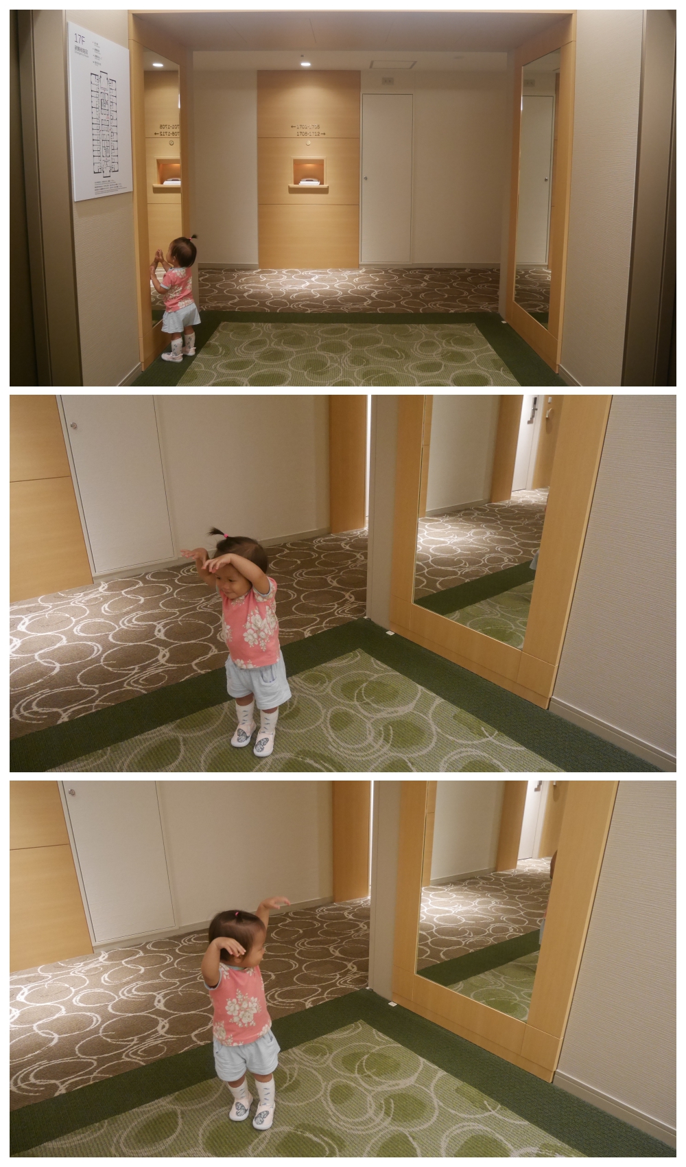 曉好喜歡lift lobby嘅鏡子﹗呢個trip佢好鍾意咁樣整隻手然後講「嗚~」我哋一直都唔知咩意思,直至有次同佢唱讚美之泉時,唱到嗰句「使讚美之泉,流『入』~每個人的心間」佢到個「入」字時就做,先知道呢個「嗚~」嘅意義﹗打blog嘅呢一刻相隔咗半年,佢而家已經唔會做lu~
