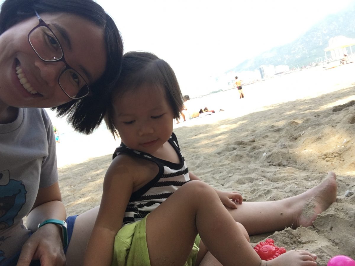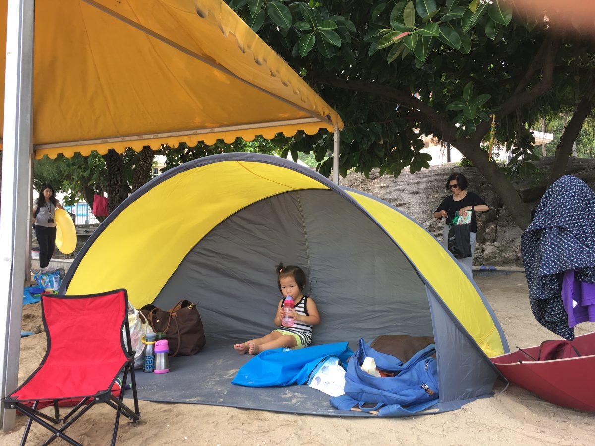 上年其實一次都冇去過沙灘,曉反而係前年大概五個月大左右去過一次(因為嗰次成個屋苑室內室外全部停電,就相約公公婆婆一齊去沙灘),嚴格嚟講直到今年年頭佢都未試過去沙灘玩~今年春天天氣未完全暖時我同佢去過一次,佢唔肯除鞋,又唔肯行落啲沙度,一直坐係石壆上面玩沙~後來天氣暖咗之後,帶埋個帳篷同爸爸一齊去咗一次,嗰次都係唔肯出去沙地玩,又係坐係帳篷邊度玩沙,想拎啲水返嚟都要抱住去拎~今次嘛,因為星期一去大樹先生的家時,係個室內沙池度玩得高興,又肯坐係沙上面玩,今次應該ok了~