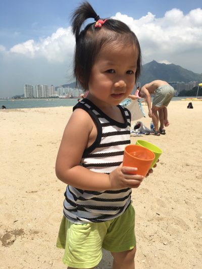 奕朗哥哥放暑假,金姨姨好積極為佢安排周圍玩,上個星期上咗嚟我哋屋企玩啦,又一齊去咗書展啦,星期一一齊去咗大樹先生的家啦,今日適逢天氣晴朗,決定一齊去沙灘玩~佢哋而家變成沙田人,去邊度沙灘都遠喇,我哋梗係方便啦,約咗係黃金泳灘,行路去就ok lu~曉而家出街行路越嚟越乖,由屋企行去黃金泳灘應該都要15分鐘,佢完全冇叫過要抱(當然我事先做定功課、催咗眠啦)~