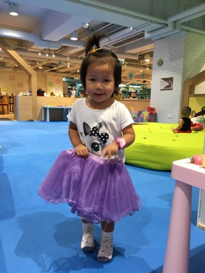 有一堆衫可以扮鬼扮馬,呢條紫色紗裙佢好鍾意,但就唔肯著,拎住嚟影相就ok~佢完全對飛機師嘅制服冇興趣~