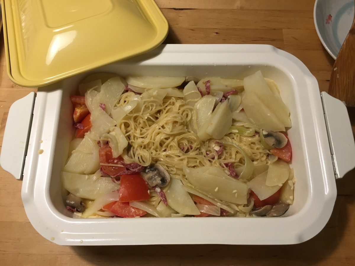 原來熱力都幾夠,開頭炒啲洋葱好快就好香lu,成間屋都係香味~(係咪好事?﹗)材料全部略略炒好之後,加啲水同牛奶,落埋啲天使麵落去,就可以由得佢一鑊熟啦~平時煮意粉要先烚好,又過冷河又再煮汁都幾多步驟,用呢個一鑊熟方法,成件事即刻變得好簡單,煲都洗少隻,仲可以直接上碟添~