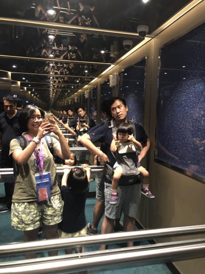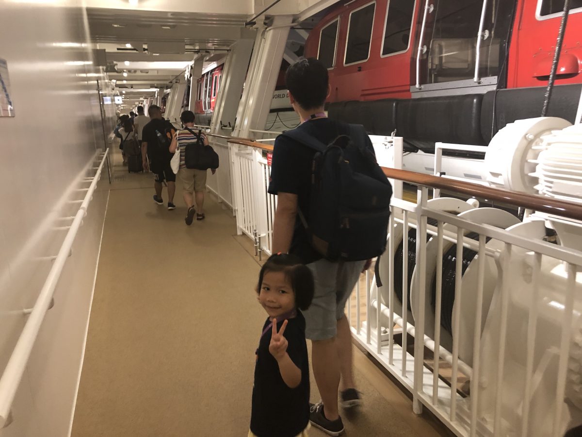 七點零鐘我哋開始去排隊登船,因為唔同房型排唔同登船隊伍,所以我哋四個就同其他人分開了~太婆向郵輪公司借咗輪椅,始終九十幾歲老人家要排咁耐隊,同埋係咁大隻既郵輪上面走動都會好辛苦~好在太婆有輪椅,又好在我哋寄咗行李﹗真係估唔到排隊登船排咗成個鐘﹗﹗打蛇餅不特止,仲要好長時間條隊完全停頓,唔知發生咩事,又冇職員出嚟解釋,乘客都數度鼓譟,我估都好大係呢個原因,令day今次覺得「郵輪唔好玩」,上次去海洋神話號真係好好架,我哋下次去番Royal Caribbean既船啦~再試多一次啦~打blog時我專登search番當日既whatsapp記錄,我哋應該由七點幾排排排到八點幾先上到船~條隊唔郁時點樣安撫兩個小朋友呢?我講咗帶嚟既故事書講咗好多次啦,又出動餅餅啦,又唱歌啦,我個心又急得不得了,又擔心佢哋未食晚飯就會好眼瞓,好不容易終於上到船了~