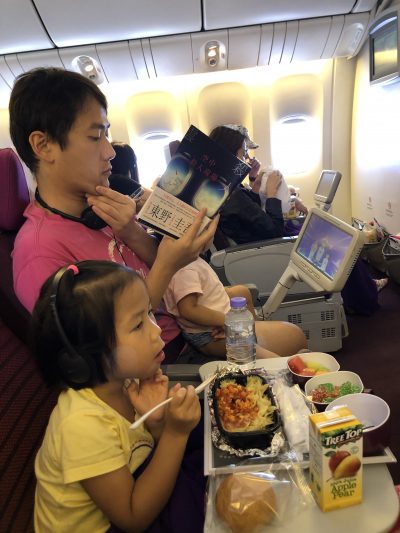 講起機上娛樂,上次搭國泰去台北最開心,曉有得睇配咗廣東話既Dora the Explorer,我又有得睇Running Man,day又搵到心頭好(有時係烹飪節目,有時係電影之類)~今次搭泰航,口味冇咁香港人,但好在泰國小朋友似乎都好鍾意Pink Fong﹗﹗有半個鐘既Pink Fong music video,曉就睇得好高興,詩呢,唔鍾意個headphone,冇音樂既Baby Shark邊度好睇呢?所以只睇得一陣~