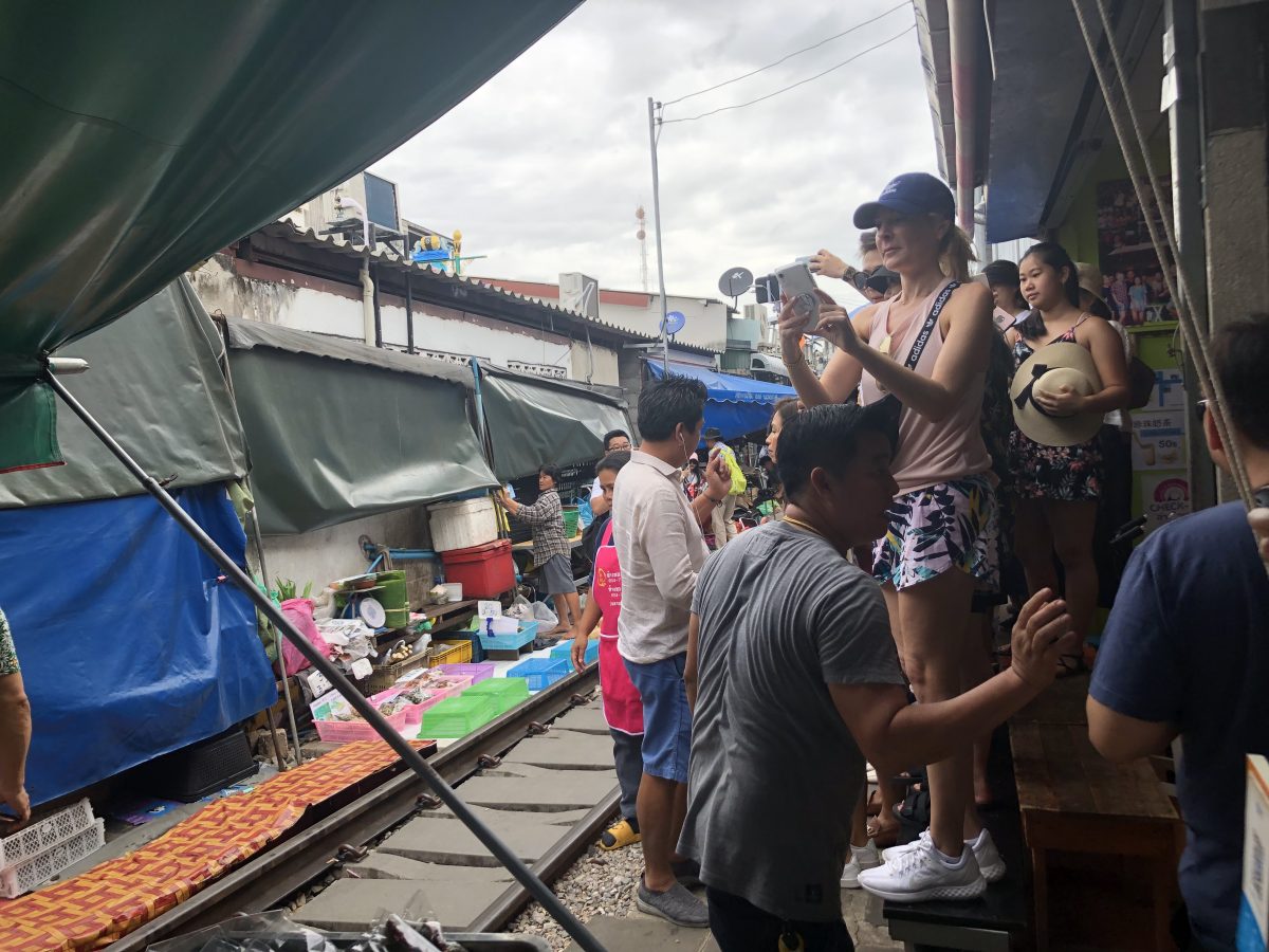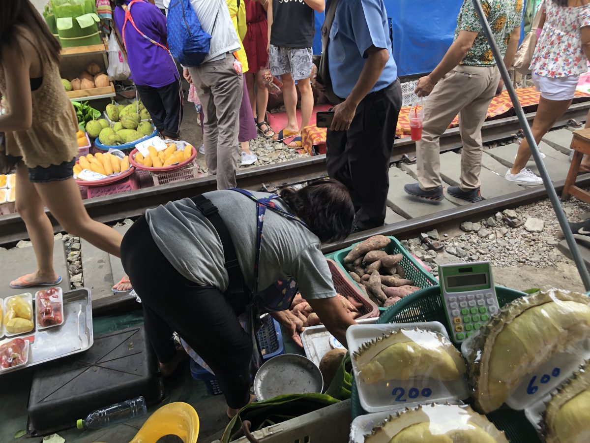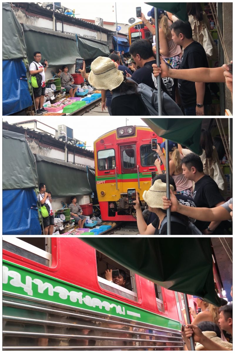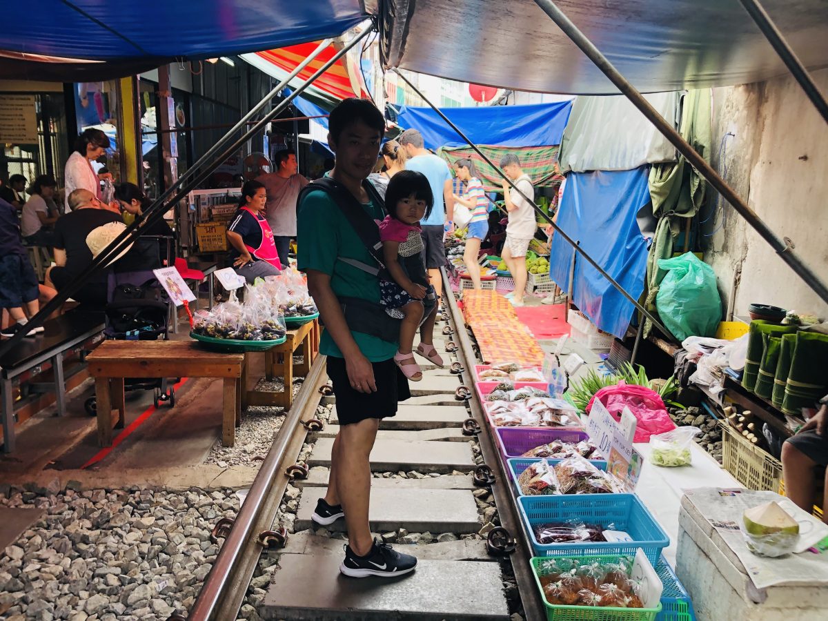 我都唔係好記得邊個幾時有瞓點樣瞓嗰啲啦,總之我哋去到第一個目的地—-美功鐵道市場~睇番blog先記得,原來上次同家姐嚟泰國時都有plan過要嚟,但後尾交通上花時間太多,放棄咗,只去咗Amphawa水上市場~我其實都有同曉係電視睇過旅遊節目介紹過,當時都覺得好amazed,點樣可以一日幾次係條火車軌上又開檔又收檔呢?好耐以前可能真係一個有必要地咁樣運作既市場,而家其實已經變成做show俾遊客睇吧?
