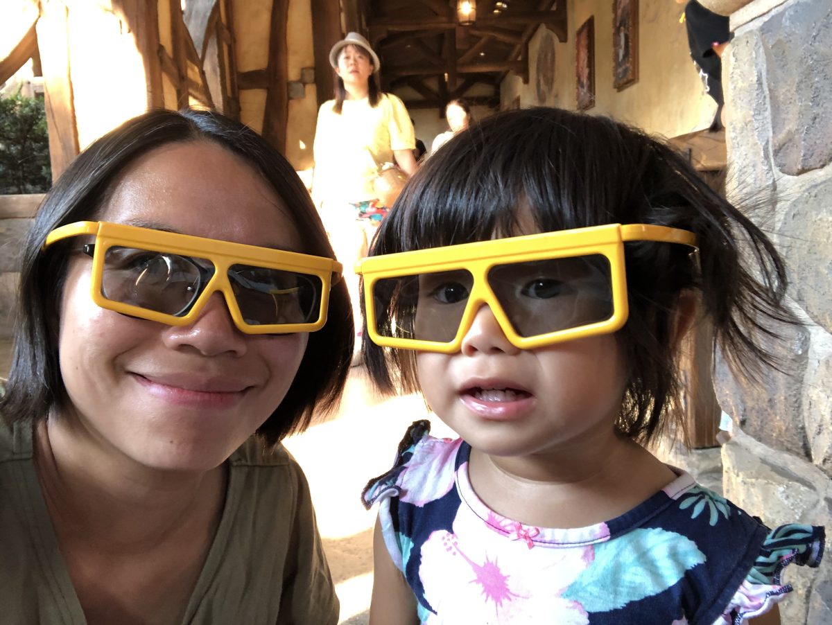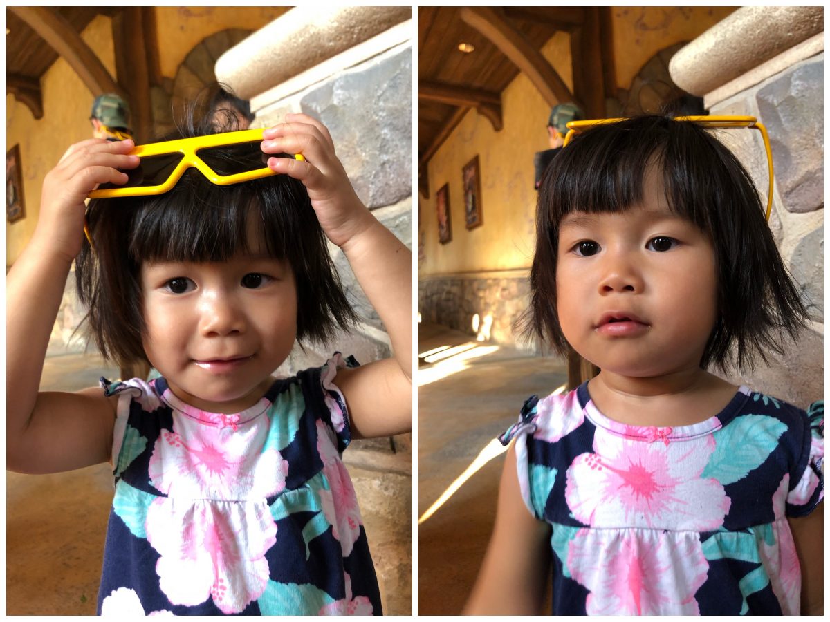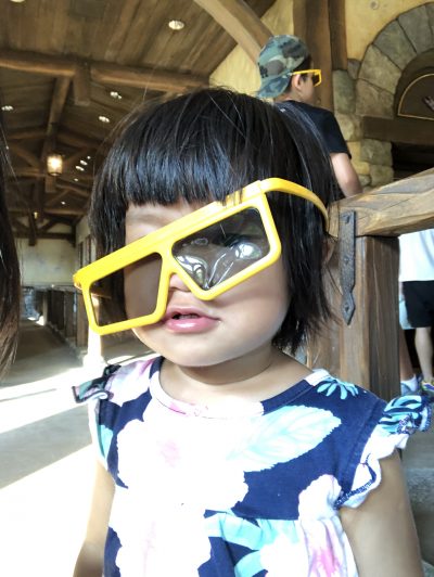曉就識得正正經經咁戴住眼鏡嚟睇喇﹗佢一如既往,睇親show都會非常專注,專注到近乎嚴肅,當其他小朋友會伸隻手去摸啲寶石時,佢依然郁都唔郁,但到個show結束時,就話唐老鴨飛咗去個窿度好搞笑~我哋睇米奇幻想曲時,因為音效好大聲,詩詩都醒咗啦~