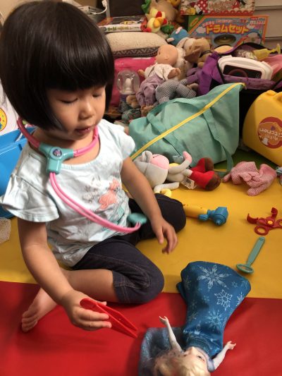 搞鬼既係,本身屋企係有醫生玩具套裝可以用嚟扮醫生,曉居然搵咗冬天戴既手襪出嚟,用嚟做手術時戴,咁我又平平地買咗啲繃帶同埋棉花球俾佢哋玩~