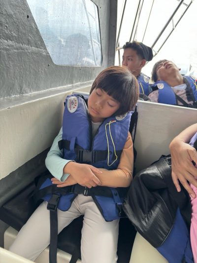 坐乜船我都冇乜所謂,於對於膽小曉嚟講,原來呢隻船對佢嚟講係極恐怖、極大挑戰~day 3先係吊橋上面嚇完,今次又再一大驚嚇,隻船經過大浪時拋一拋,pat pat離一離開張櫈,大家興奮地尖叫時,曉變成慘叫,一直驚到大喊,跟住開始鬧人,最後變成默不出聲強忍不安,我一直攬住佢都愛莫能助,但求嗰45分鐘船程可以盡快結束~