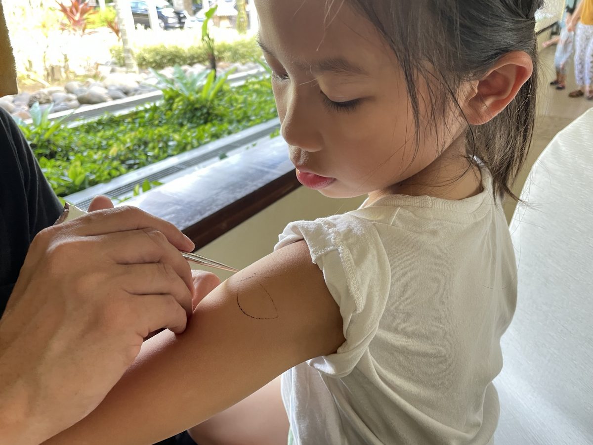 詩通常義無反顧,乜都想試下,曉就比較深思熟慮,個叔叔話圖案會keep到一個星期左右,佢擔心畫咗會影響返學著校服,所以有啲猶豫~傳統henna係畫係手背至前臂位置,但個叔叔提議小朋友唔一定要畫呢啲圖案,可以畫下其他,所以結果兩姐妹一人一隻蝴蝶,曉唔想返學露出嚟嘛,就畫係手臂啦,詩冇乜所謂,畫咗係手腕位置,我揀咗傳統款,畫係手背~