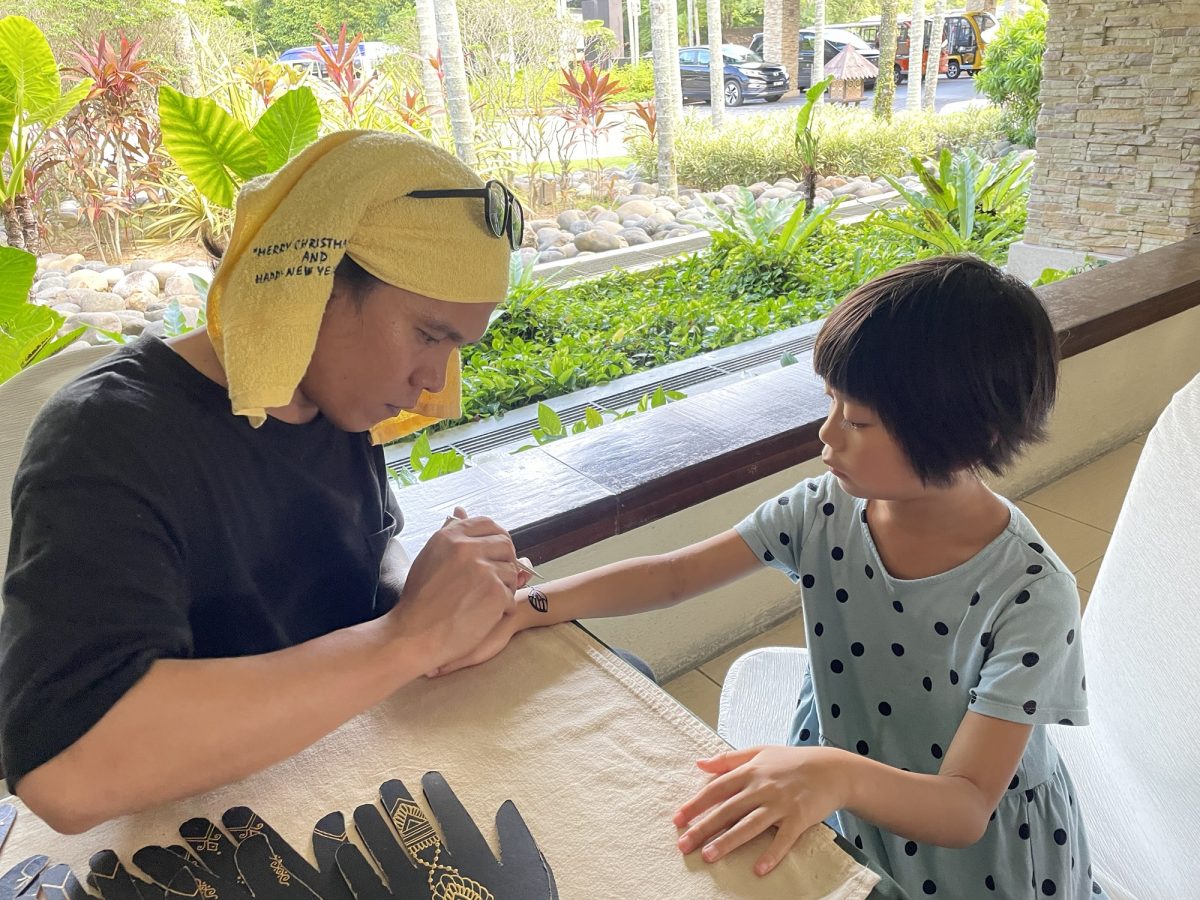 做完treatment我坐番shuttle返Garden Wing lobby,同三父女會合,發現有個檔口幫人畫手,之前去Mari Mari文化村錯過咗畫henna嘅機會,今次好想畫呀﹗記得當年去印度時第一次體驗(請參閱:11-5-2008:udaipur的庭園與文化),嗰陣襯埋成套印度傳統服裝好靚,今次都想俾兩個女試下~我就叫佢哋過來會合~