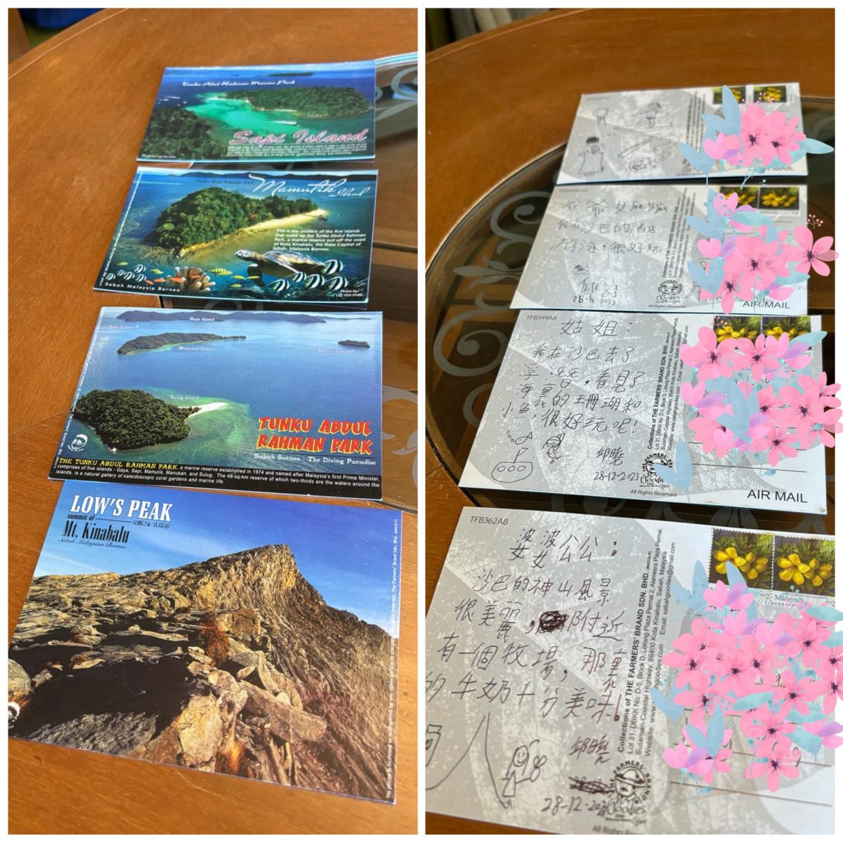 有咗兩個小朋友之後,之前寫postcard都係俾曉寫字,我哋其他人畫畫,而家連詩都K.3,可以寫好多字啦,我哋將重任—-其中兩張postcard嘅地址,交俾詩詩寫﹗﹗內容方面,詩都心懷大志,除咗畫畫之外,仲寫咗啲文字旁述,希望爺爺嫲嫲公公婆婆睇得開心啦~