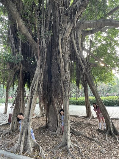 見到呢棵樹,我話我細個時都影過一張扮托起棵樹嘅相,三個就好合作咁去扮晒嘢,表情正呀﹗