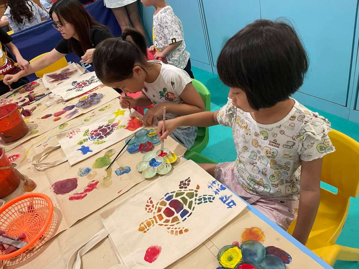 今日11點鐘嘅付費DIY手工係印畫環保袋,有個烏龜窿窿圖案板,用海綿沾上各種顏色印上去,烏龜就出現啦~