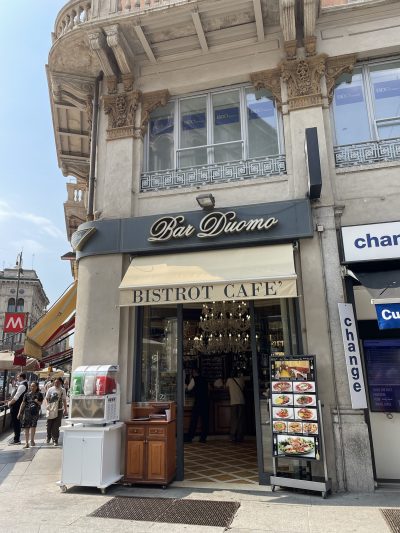 覺得坐一陣飲啲嘢食啲嘢可能會好啲,唔係好熟悉呢度食嘢係點情形,之前睇旅遊書話意大利人食早餐好簡單,可能係一隻牛角包加杯咖啡,晏少少又食啲甜嘢又飲杯咖啡,中午可能會食啲pizza、panini之類,每日最豐盛嗰餐係晚餐~我哋有入過去啲鋪頭,好似冇凍嘢飲啱曉,跟住又出番嚟~跟住米蘭大教堂方向一直行,行行下我哋就知道肯定冇行錯路了,因為有一團又一團嘅旅行團向住同一個方向行,入到去一條步行街,就感受到旅遊區嘅氣氛了~