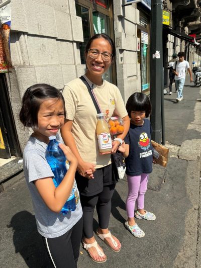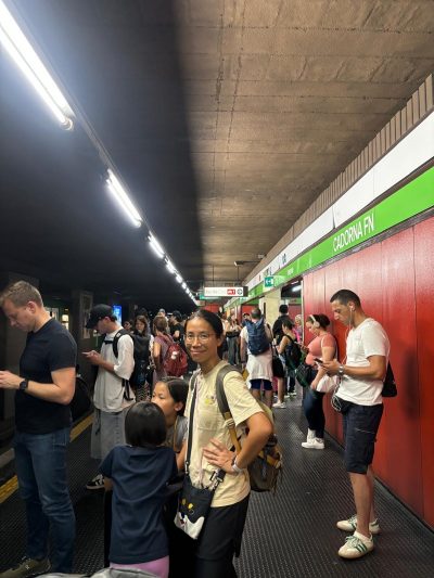 米蘭嘅地鐵可能真係有啲歷史,實在…麻麻地﹗站內指示唔清晰,車站非常熱,企係度等車乜都唔做都成身汗,最搞鬼係個到站時間顯示牌,先一秒明明顯示話仲有六分半鐘到,轉個頭居然變成七分鐘﹗﹗令兩個攰到極點嘅小朋友非常崩潰~車廂都好多人,我哋費事兩件大行李塞實晒,同爸爸分開咗企~
