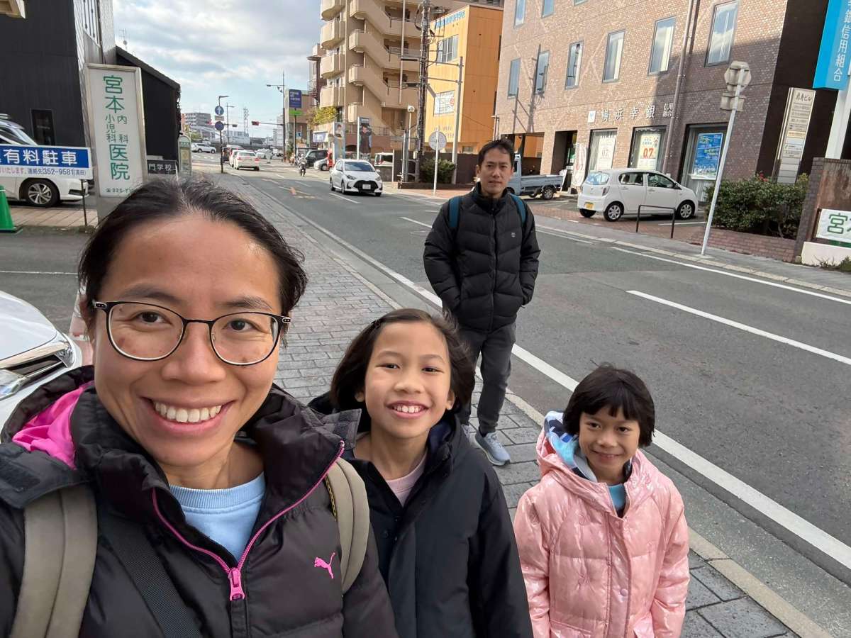 街道好乾淨,空氣好舒服,行起上嚟我、day、詩都覺得唔凍,唯獨曉覺得凍,明明佢件羽絨先係新買架喎,點解呢?今日都還好,未至於話要改番搭車或者入去室內暖暖或者要買熱飲,後來行起就ok了~行下睇下嘢影下相,結果我哋花咗42分鐘,行咗2.35公里去到熊本城﹗