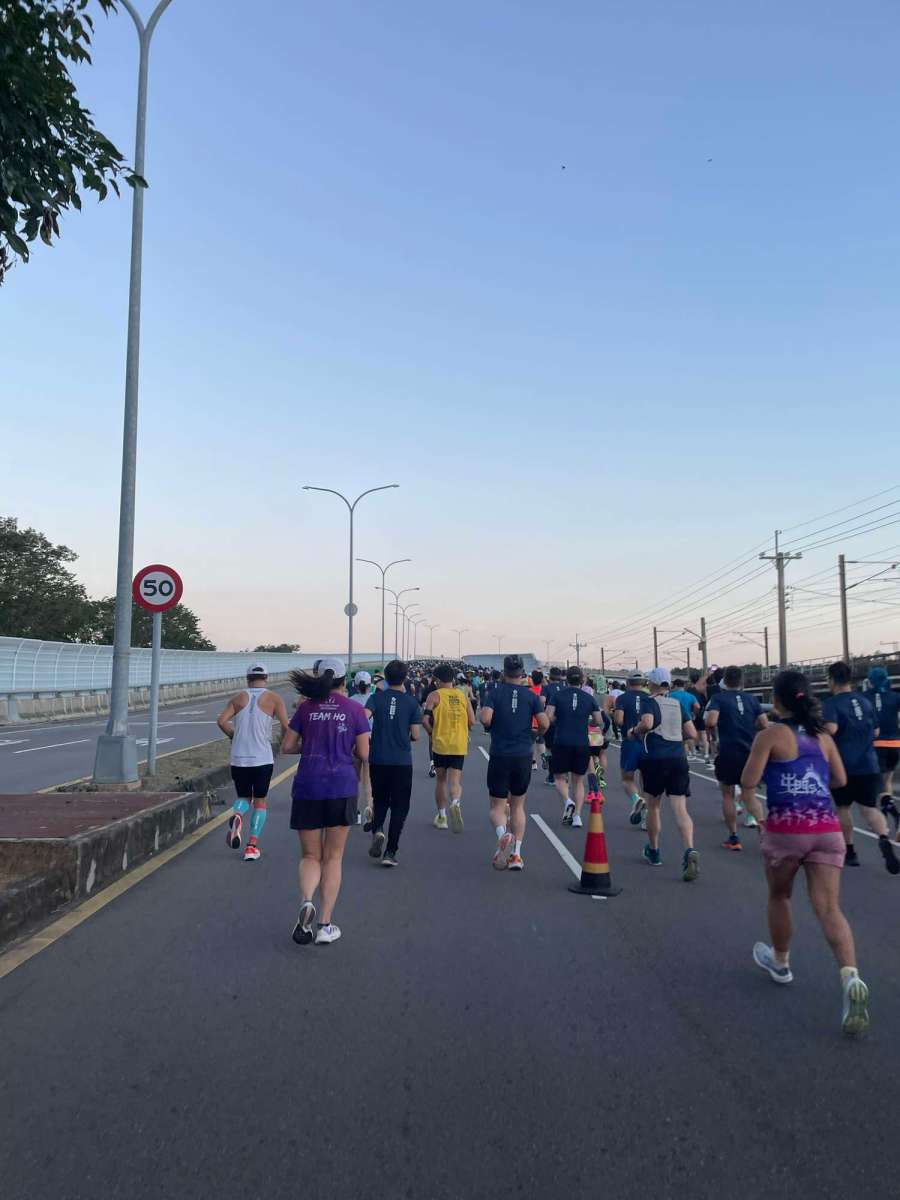 一開跑冇幾多步就一條大斜路上橋,首段主要係好闊嘅公路,所以好多人聚埋一齊跑都唔會太迫~今次比賽真係好多補給站,都未需要飲水,2.5km已經出現咗第一個水站,我都意思意思飲咗少少水~