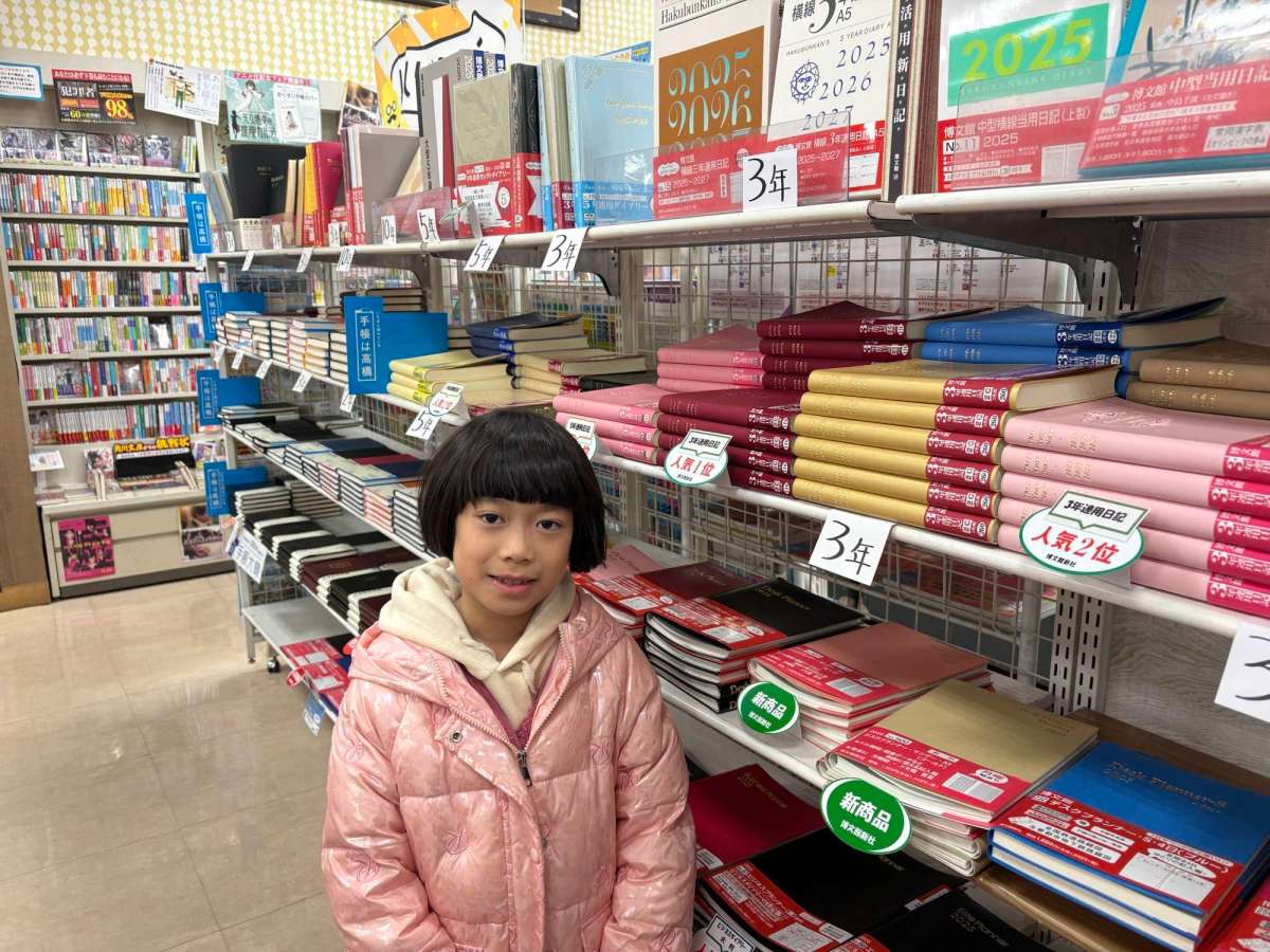 我哋買咗一本10年日記呀,係呀,真係可以寫10年㗎,1月1日嗰一頁分開10格,由2025寫到2034,如果我哋真係堅持寫落去嘅話,wow,寫到曉19歲!詩16歲!umum⋯打blog嘅呢一刻係去完旅行之後嘅三月中,errrrr⋯我哋都仲有寫緊嘅,不過冇之前咁勤快囉,有時可能隔咗三兩日先補返寫,呢個確實唔係好現象,不過我會堅持將本日記放喺當眼處,即使最後得返我一個寫,都寫啦~因為好擔心會悶會冇嘢做,喺書店,仲買咗一本Sudoku雜誌同埋一本靚靚兔子填色冊,返到去點都有啲嘢可以做呀嘛~好似仲買咗把文具鉸剪,因為感覺日本啲鉸剪會好好剪^^;