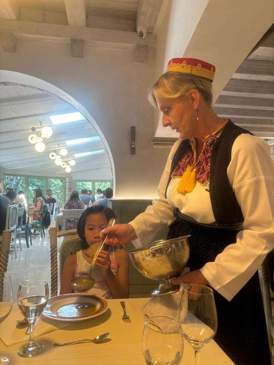 呢間磨坊餐廳嘅職員都着住克羅地亞嘅傳統服裝,導遊話我哋聽,原來啲女士嘅帽嘅顏色,係可以反映到佢哋嘅婚姻狀態㗎,唔知有冇記錯,白色係未婚,繡咗玫瑰係訂婚,紅色係已婚,黑色係寡婦~咦,serve我哋嗰位係紅色喎!