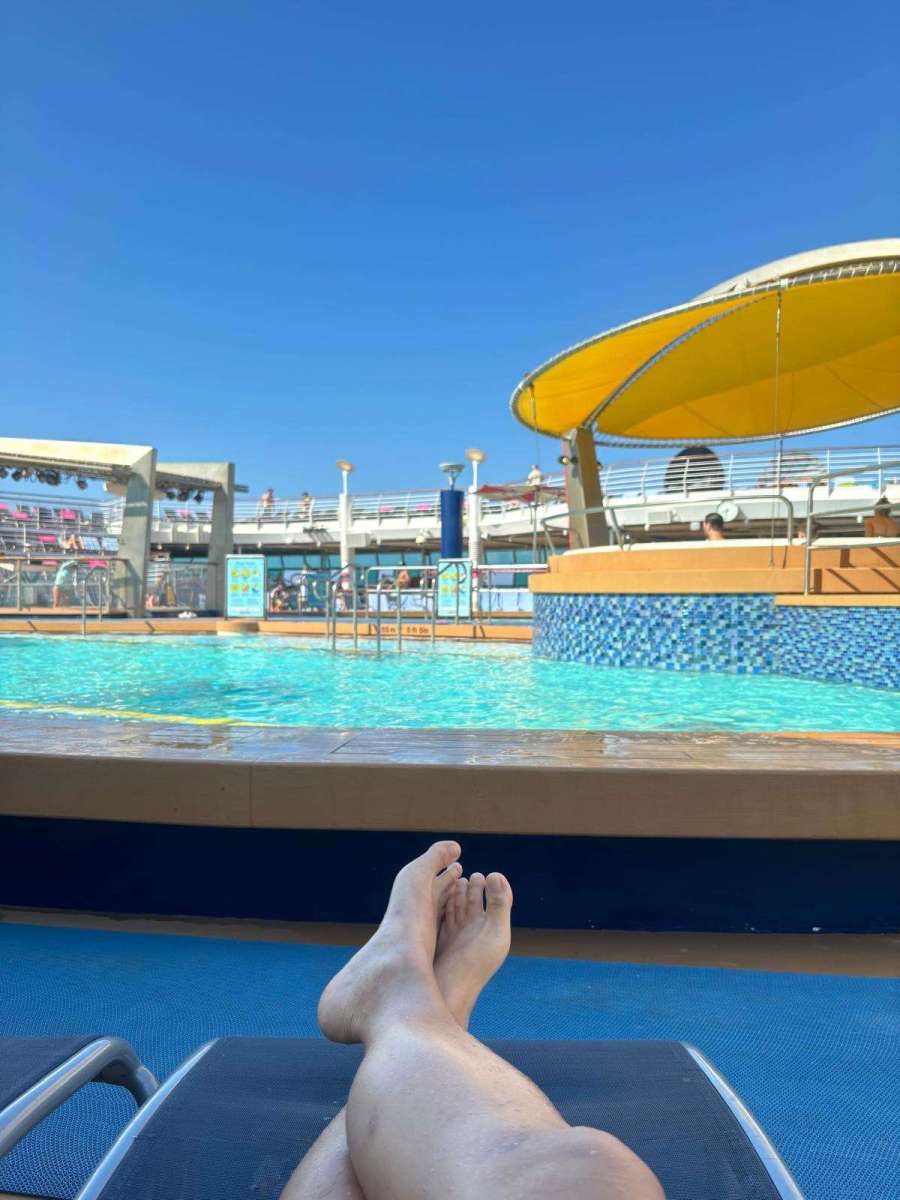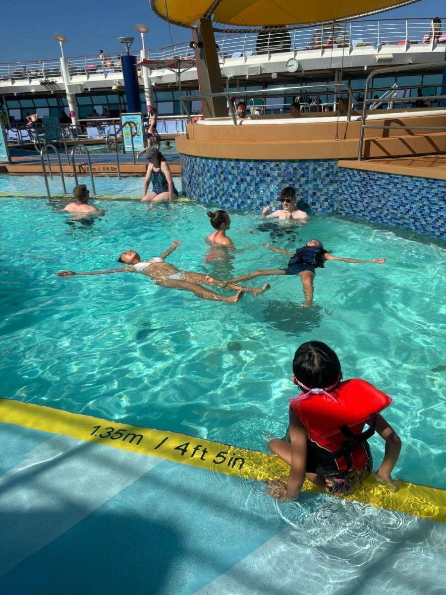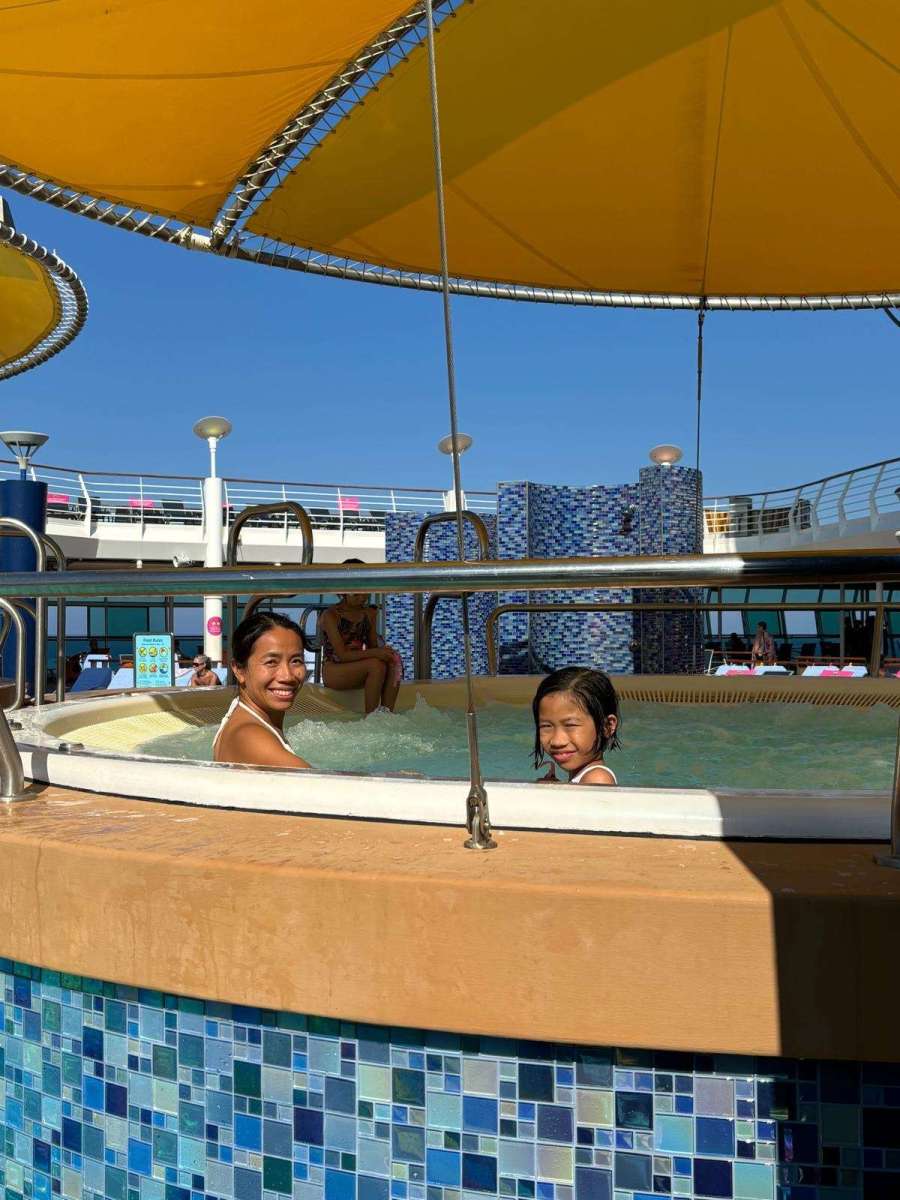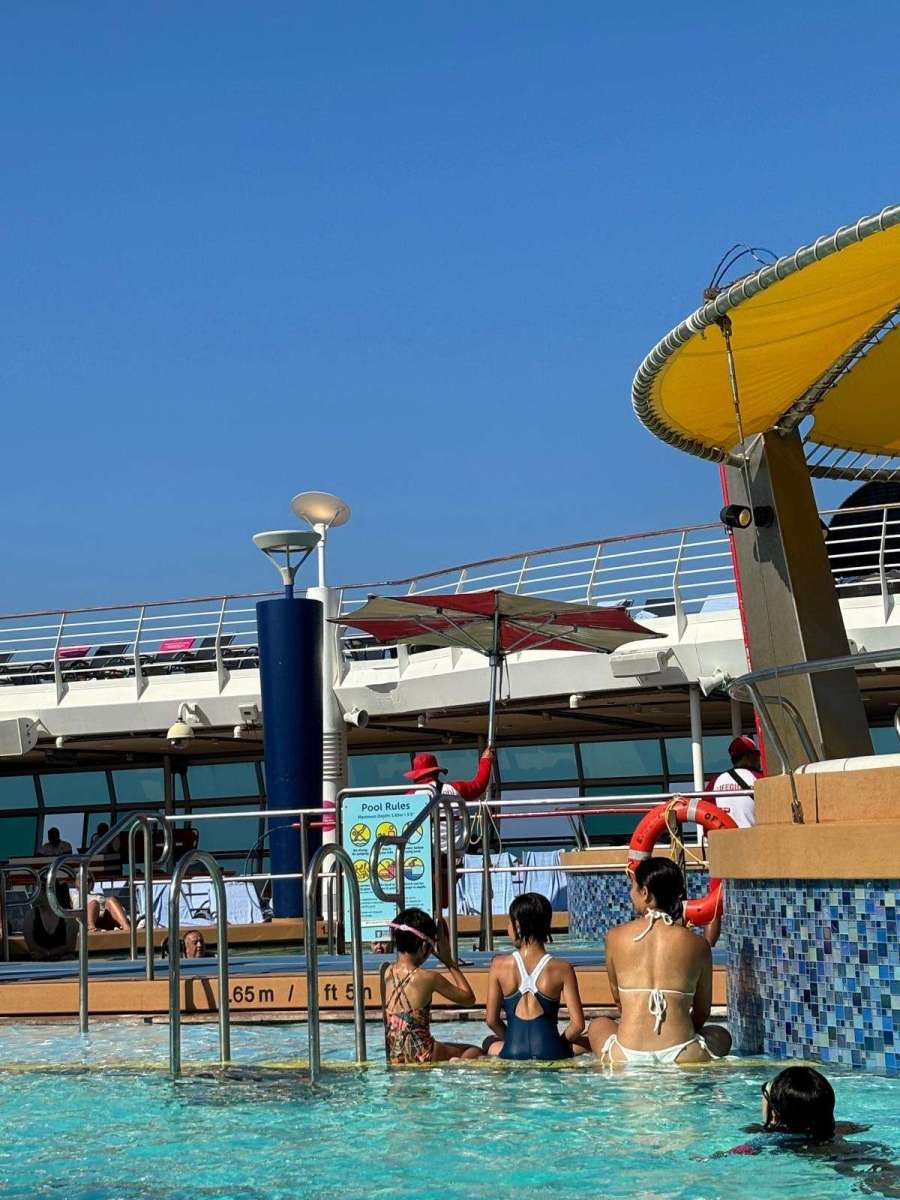 比起游,其實係嘆居多,個池好細,腳一伸都差唔多到對岸,不過好深水,兩個小朋友腳都唔太到地,所以郵輪提供咗各種size嘅救生衣,比大家着嚟浮下~泳池水都好凍,游住就ok,停低落嚟會凍,所以大家都好鍾意有暖水嘅按摩池~