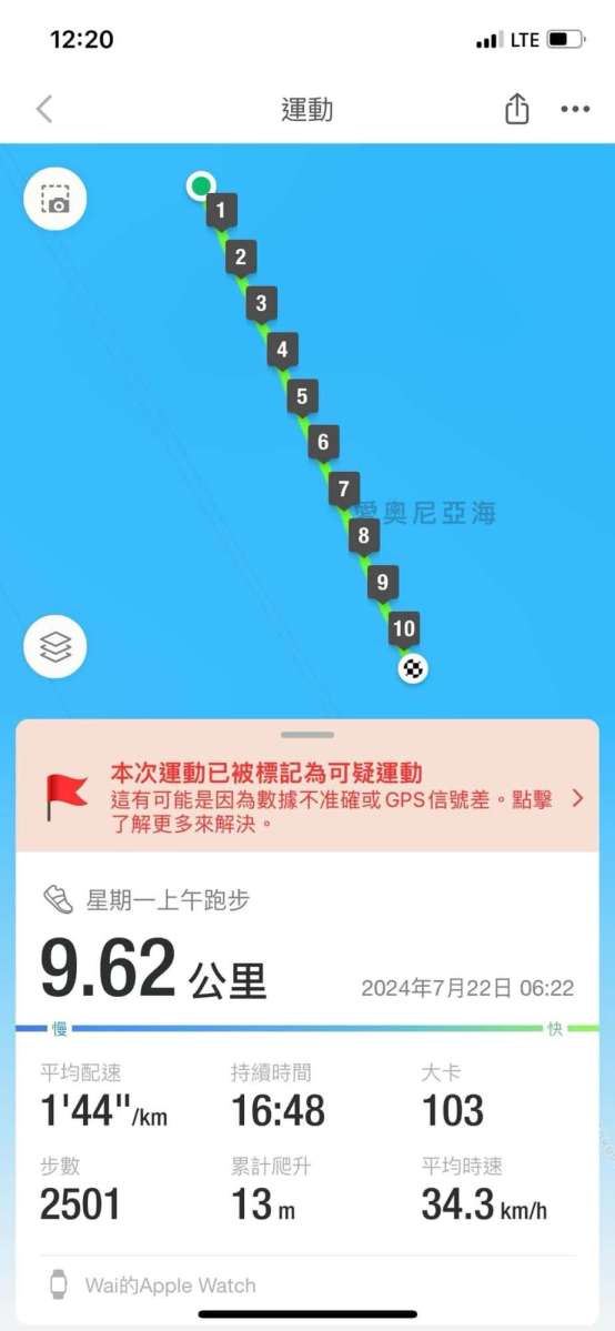 因為我一邊跑時架船繼續航行緊,所以我呢次跑步變得「好可疑」,16:48居然跑咗9.62km,好似車咁快﹗哈哈哈,仲要係個海度移動~