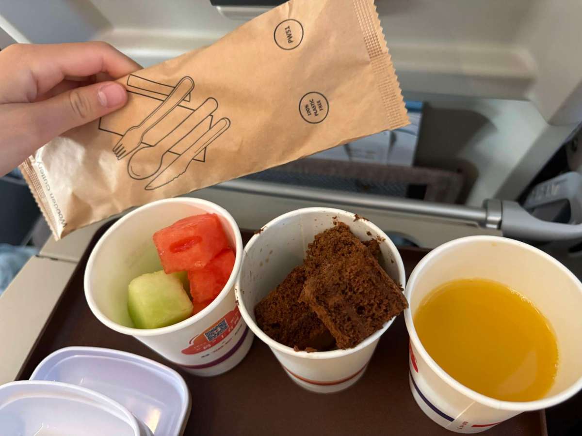 飛上去冇幾耐就派飛機餐了,寫住係「snack」,估唔到咁大份,有齊主菜、小食、水果、甜品、飲品﹗﹗咁當然,我哋唔係機場食lunch嘅話,又捱唔到咁耐先食嘢嘅~個米粉我食唔晒,西瓜拼蜜瓜、朱古力cake我就清晒,獨立包裝嘅小蛋糕卷可以帶走,全靠呢個小蛋糕卷,day 2嘅早上佢哋先捱得住~
