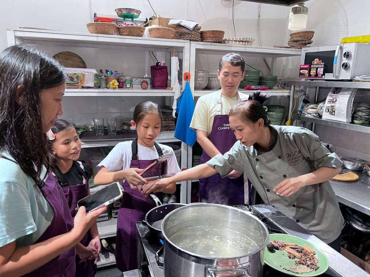 無論係雞肉湯定係素菜湯,都落好多香料,唔記得咁多啦,好奇嘅話要睇返個食譜,原來個雞肉湯用咗啲大雞髀去煲,煲到骨肉分離,會撈返起啲肉上嚟,手撕成肉絲,到時用返喺個河粉度~純素食者外國女生,對於廚房嘅用具有冇掂過啲肉好緊張,我都覺得有少少心理壓力,一般餐單同素食餐單同時喺同一個廚房度整,究竟work唔work呢?可能烹飪教室要modify下啲工具,例如一般餐單用紅色夾仔紅色勺子紅色筷子,素食餐單就用綠色夾仔綠色勺子綠色筷子之類嚟分清楚~
