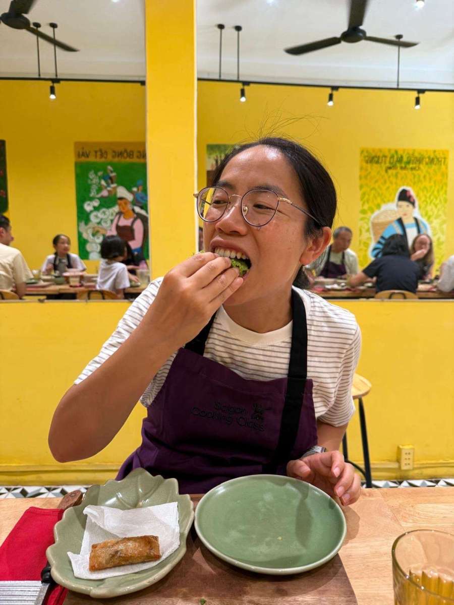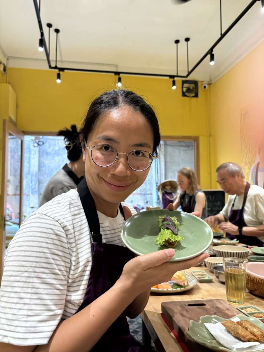之後到重點啦,主廚One教我哋用生菜、各種香葉,裹住剛剛炸好嘅春卷嚟擺盤~