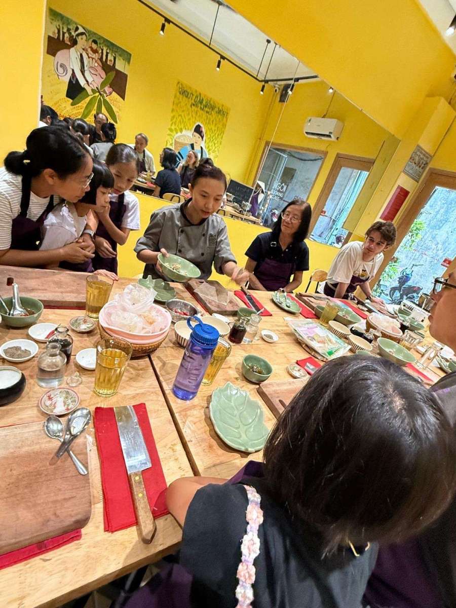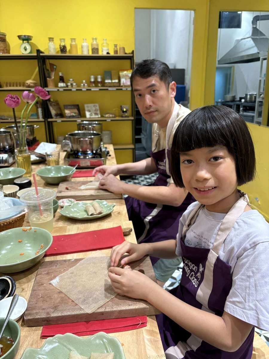 今日烹飪班嘅菜單,有越南春卷、香蕉花沙律、越南雞肉湯河粉~大枱嗰度主要俾我哋預備食材、切嘢、調味、擺盤、食用,唔似得泰國嗰次Blue Elephant人人都有個爐頭,好處係安全啲,特別係對小朋友嚟講啦,不過煮食要用火嘅部份,就集中喺裏面嘅廚房,就變成唔係人人都有機會落手去做~