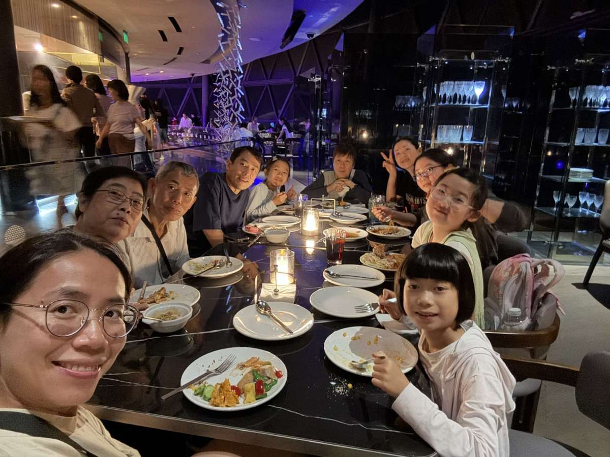 原來遊覽觀光層唔需要一個半鐘頭咁多時間,可能大家都攰吧,未夠鐘可以入座食自助餐,但全部人已經冇晒電,要搵位坐下~