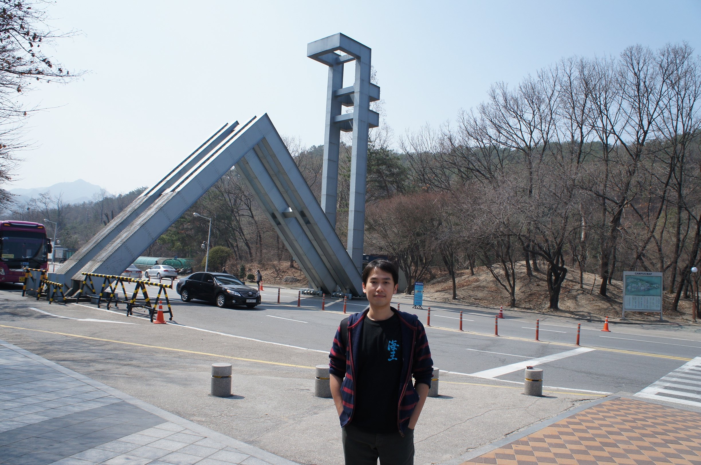 係落車o既巴士站見到車身廣告,我哋認得係東方神起﹗話說我哋本身都唔係好識佢哋,但係之前偶然係J2睇咗啲咩亞洲音樂節之類的節目,見到佢哋表演,我哋好奇怪,模糊印象之中明明東方神起好似有幾個人o架喎,點解嚟嚟去去得兩個係度跳o既?﹗我哋仲專登search咗wikipedia睇下,哦,原來有幾個退出咗…得番兩個人好似好寂寞咁…因為我哋對於首爾大學手頭上o既資料係零,所以我哋要睇地圖,而只有一個目標希望達到,就係睇下見唔見到櫻花,其餘嘛,隨便逛逛睇下嘢咩都ok啦~