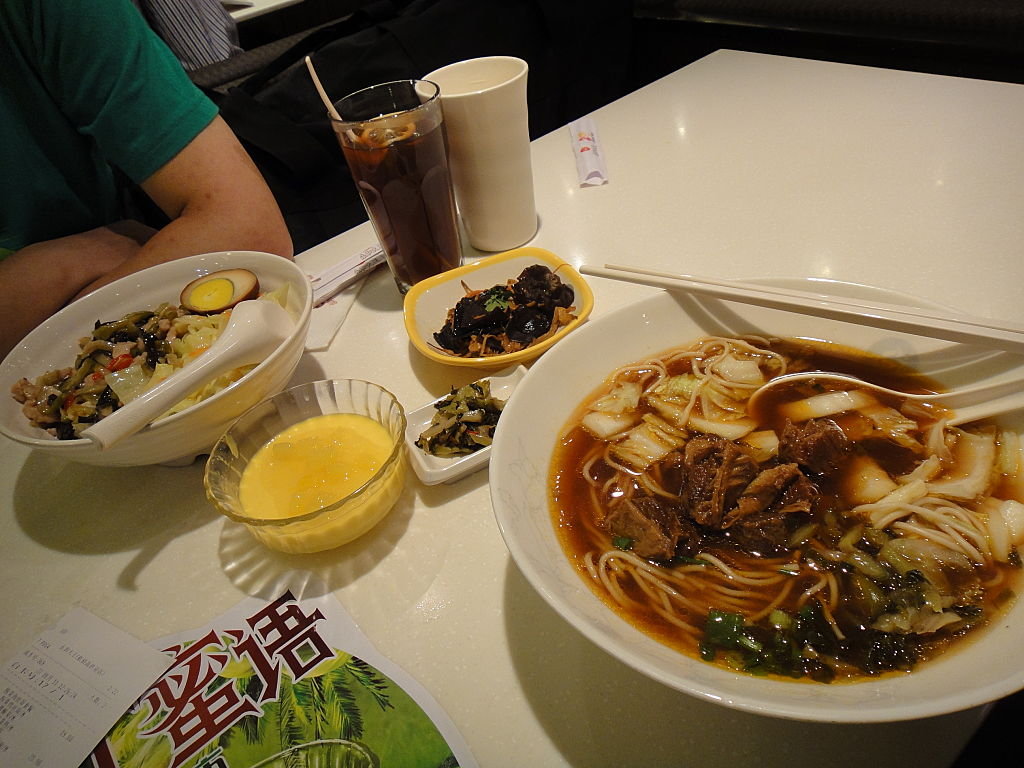 我要咗紅燒牛肉麵,day要咗炸菜肉絲飯,加個芒果布甸,職員問我哋要唔要餐,day話要啦,飲品要豆漿…上菜時又搞笑咯,有兩杯豆漿一杯熱檸茶,原來其中一個餐有嘢飲,而啲豆漿佢就當我哋散叫…搞到有兩個人三杯飲品o既局面﹗爆笑咗一輪,我好沾沾自己咁聰明地,倒咗杯檸茶落去本身嗰支康師傅紅茶入面,ok~食物味道都唔錯呀~