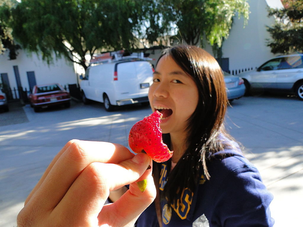 oh,係喎,我哋係農夫個檔口買咗啲strawberries喎,放係車度就會好易pat咗了,都係要拎出嚟,我哋就帶過去海灘食啦~