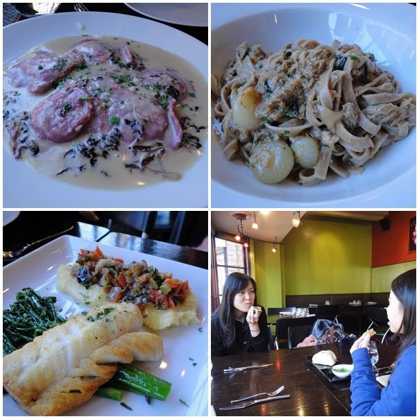 坐咗入去即刻暖晒﹗我哋叫咗三個main course share嚟食﹗左上角o既係茄子意大利雲吞,右上o既係鴨肉黑松露扁意粉,左下o既係魚柳配薯蓉,左下嗰個魚佢介紹時話係「Pacific Cod」,太平洋嚟o架喎,好似特別鮮美~:p幾樣嘢食都好有水準丫﹗good~
