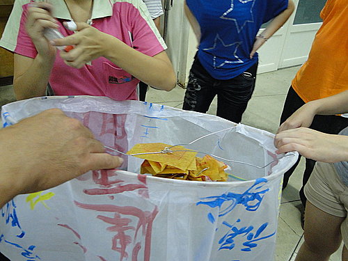 老師最後教大家點樣纏好藤圈,之後再測試天燈個頂係咪密不透風,測試完畢就可以點著佢,將天燈放上天,亦即是將願望一齊放上天咯~