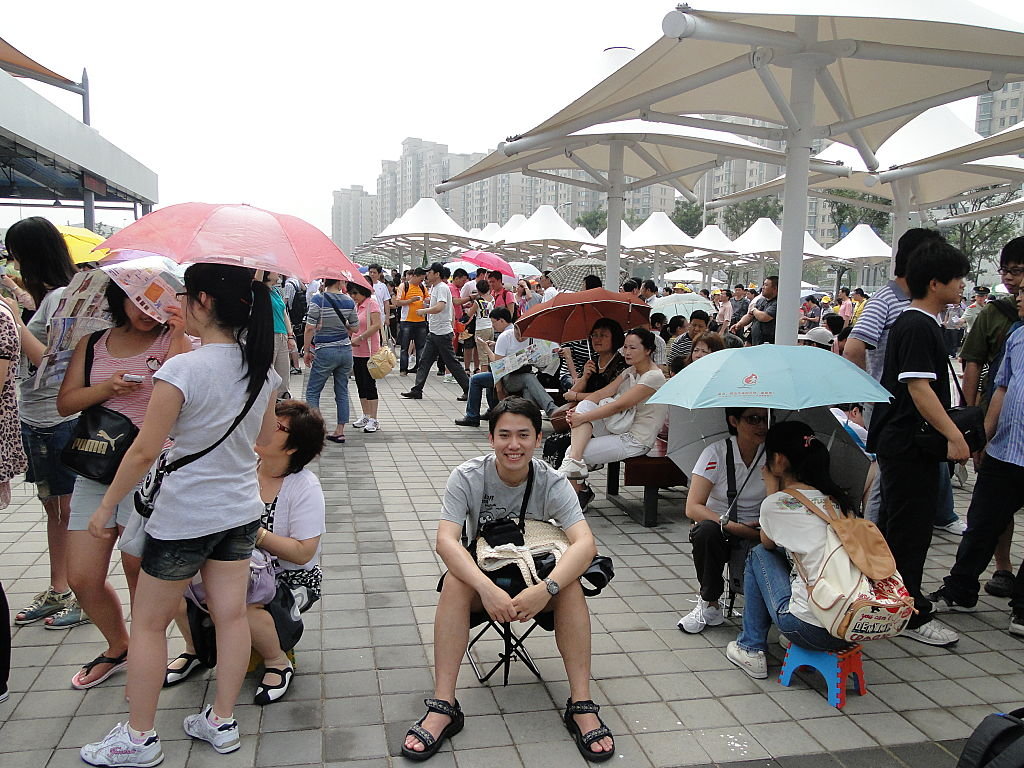 例如就係排隊等安檢o既時間咁樣坐法…大家留意﹗右手邊有位女士坐嗰種膠凳仔真係勁好o既設計,見到世博園區外面有得賣,每張10蚊﹗開合只需一秒,而且輕身,有手挽,色彩繽紛,完全符合排隊凳仔應有o既條件呀﹗大家未買凳仔又準備去世博的話,一定要買呢種凳仔~