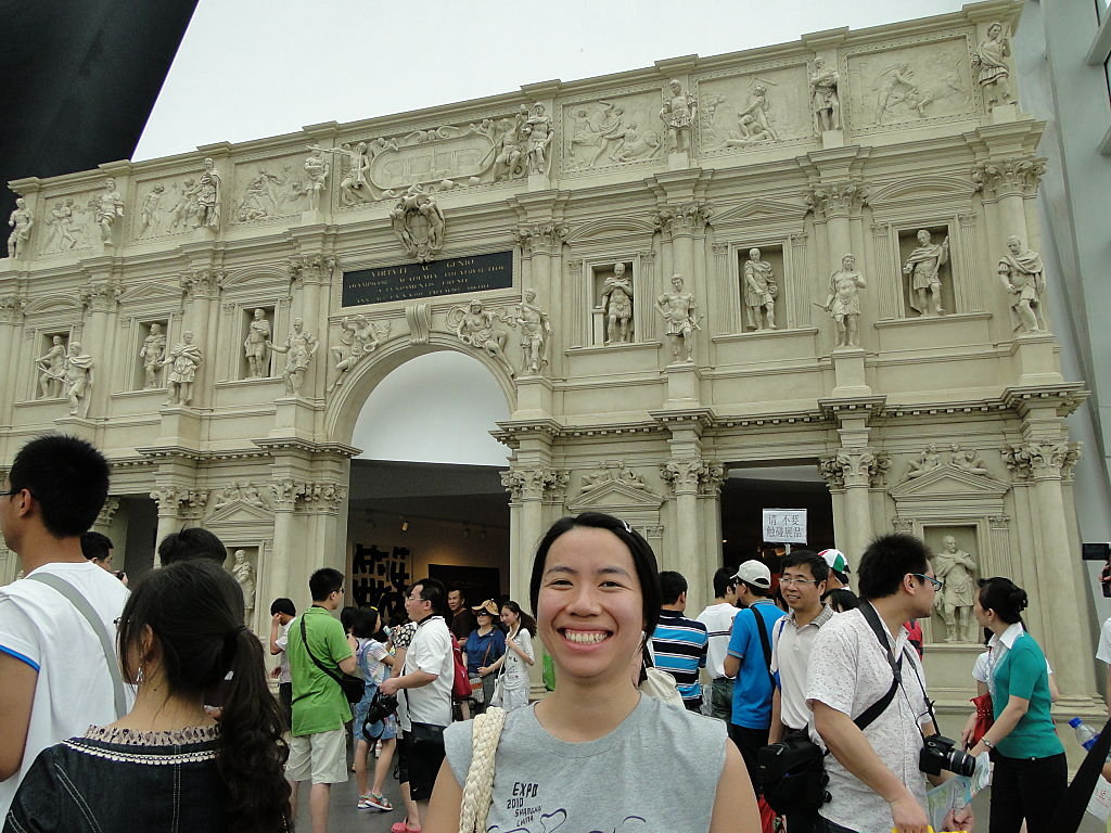 意大利館o既外型唔算奇特,不過線條簡單得嚟我都好欣賞~呢個係「自拍王」得意作品之一﹗大家有冇發覺好多時去旅行搵啲行人同你影相,影出嚟多數都唔係太滿意…:p 我哋呢張相嘛,係放係垃圾筒上面較10秒自拍﹗yeah~