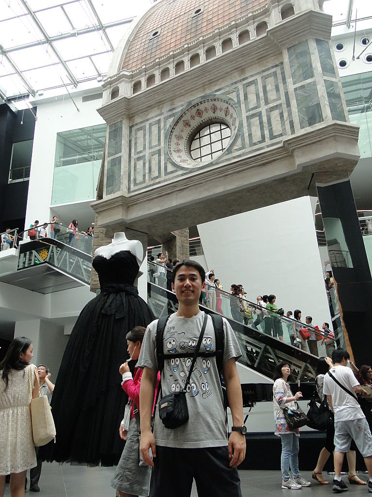 意大利館都好大,有兩層樓呢,中庭位置展示咗幾件巨型晚裝,兩幅大牆分別有一大幅十幾套o既名師時裝,另一邊牆就有一隊管弦樂團o既樂器直立咁企係牆上面~