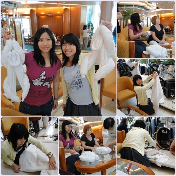 下午o既時間又叫做「at sea」啦,我哋決定參加下船上o既興趣班﹗我同家姐去咗玩towel art~地點係中庭,老師係台上示範,我哋係台下跟住做,都有少少難跟o架,我冇乜藝術天份吧?好在,結果都整咗好幾種動物,我記得有馬騮、大笨象、狗狗…仲有冇呢?