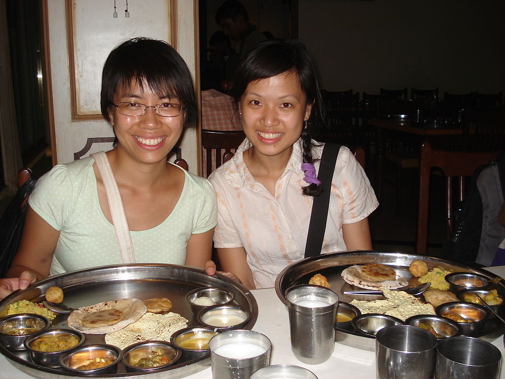 都係快快脆脆走好了~租一架auto rickshaw番酒店附近食飯,餐廳唔多呢,一係就要行好遠,我o地去o左一間只有得食veg thali(套餐)o既餐廳食,坐埋去已經有一個個不?鋼盤子放係度,上面有一個個小小o既不?鋼兜係度,我o地坐低冇耐,就俾人圍了﹗咩事?原來係D侍應拎住各式各樣o既食物分發入我o地個盤度﹗有好多款汁啦、薄餅啦、甜品啦…好澎湃﹗食到飽飽的﹗但係又好辣呀~估唔到一間鋪頭淨係賣thali都咁多客喎~有人等位添呀~