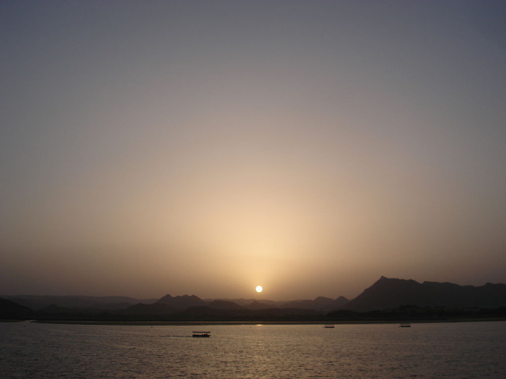 睇日落o個度真係好靚呀~~~~~~~~~~~~~~~lake pichola上有兩個palace,湖後面係層層疊疊o既山~好似中國山水畫o既background有一個漸漸向下o既太陽~天色開始黑時,jagmandir palace開始著燈了,變了夜景啦~入夜o既時候,天上面有一隻隻o既飛出o黎,雀仔?﹗唔係呀,太恐怖了﹗係蝙蝠呀﹗哇呀~~~~~~~~~~點解會咁o架?呢D係「千機變」o既場景o黎o架喎,點解會係現實出現o既?﹗udaipur唔係白色城市,而係蝙蝠城市﹗天上o既蝙蝠簡直好似孟買o既烏鴉咁多﹗