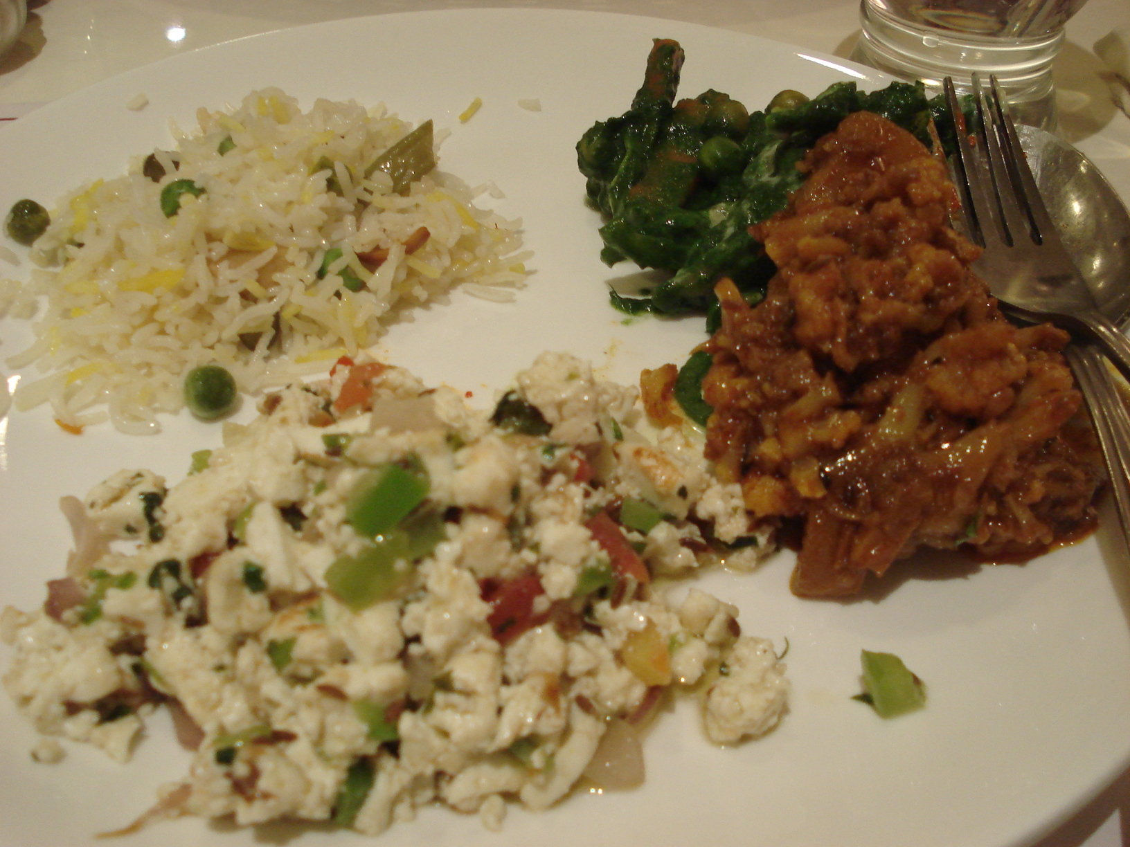 買完飛都夜啦,拿拿聲搵地方食dinner就番酒店lu,係churchgate呢頭搵o野食都唔易,行遠少少俾我o地見到呢間超豪裝修超靚o既素菜餐廳﹗每個菜Rs140-150啦,大概係我o地平時食o既雙倍,講就好得人驚,其實為起上o黎同去明星飲茶差不多o既o者~即管豪一次啦﹗入到去服務真係好好﹗坐得好舒服﹗有冷氣呀(究竟係幾時開始,有冷氣我就已經咁雀躍o既呢?)~~~~~~~~我o地叫o左一個炒飯、一款菠菜masala、一個炒cottage cheese同埋一個薯仔煮椰菜花,仲有兩款roti,人人都食到飽飽的~