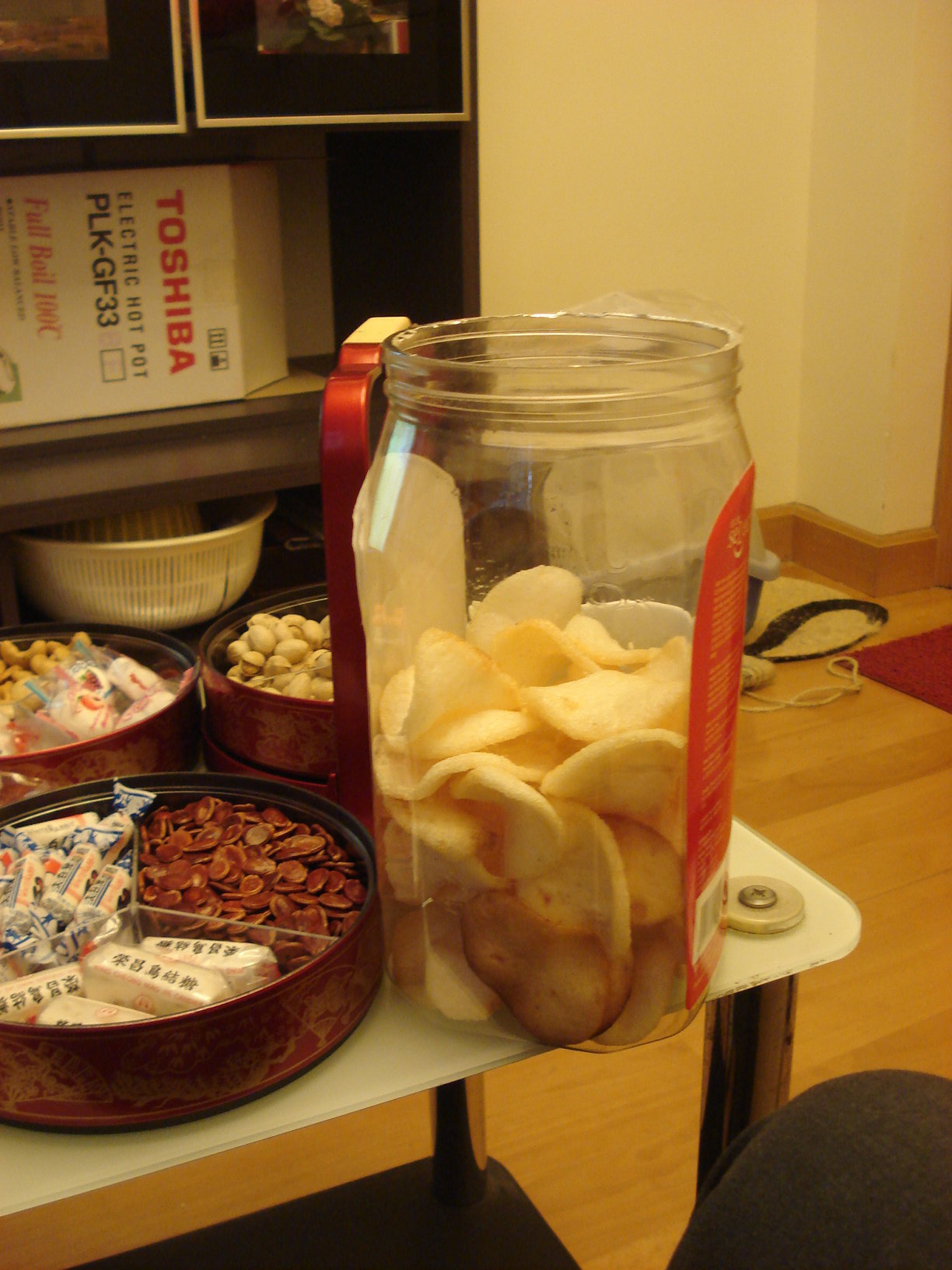 我o地最早到,婆婆打開晒D全盒呀、小食呀俾我o地jap jap jap,見到o個樽蝦片嘛?勁好味﹗我o地去到時係裝到滿o架,俾我同爸、姐jap到得番細半樽﹗舅母o黎又jap jap jap,哇,清光光﹗好食到停唔到口~後來婆婆見我o地鍾意食,俾o左一包未炸o既我o地呀~