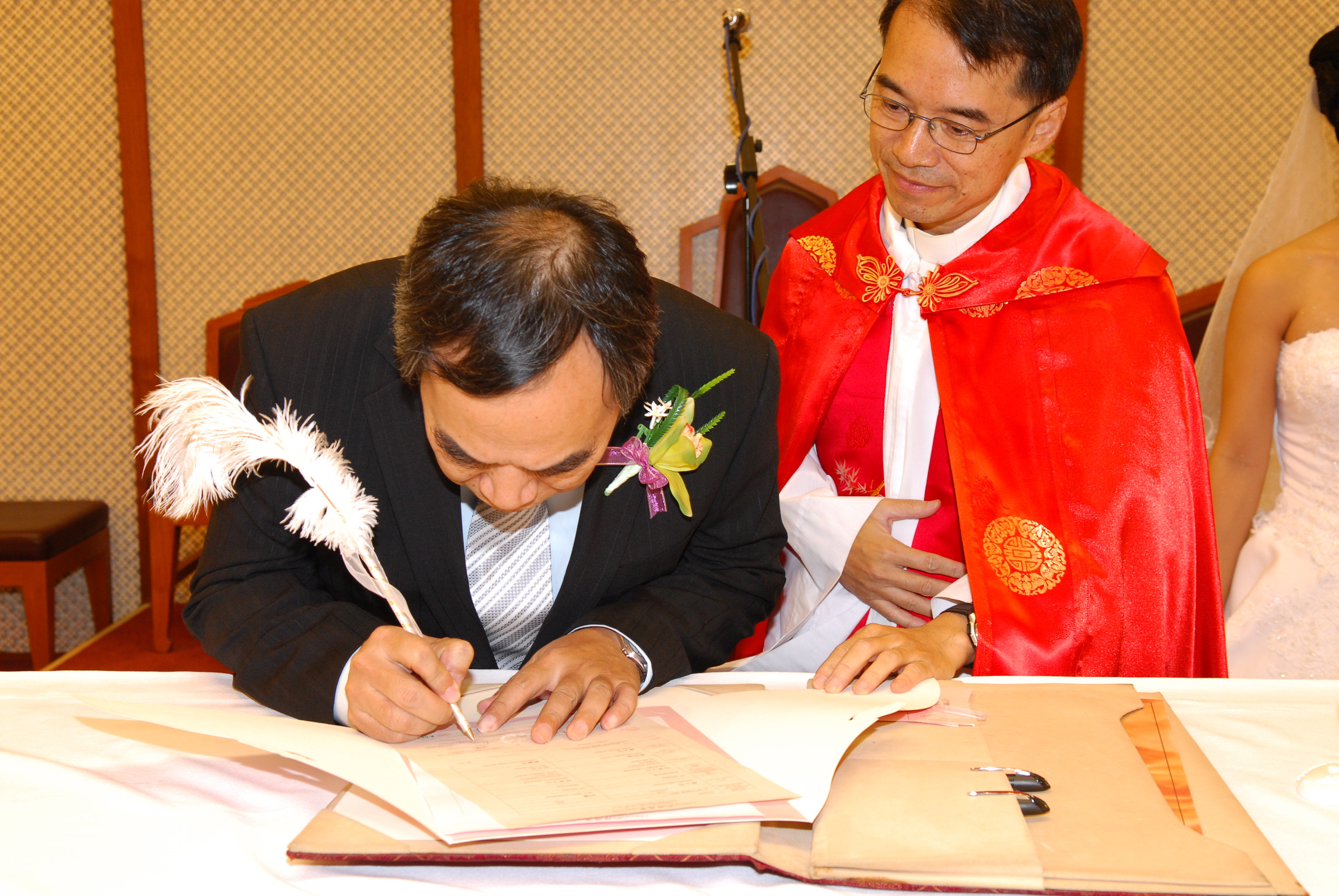 由神父+新人+雙方主婚人(多數係爸或媽吧~)簽署結婚證書~