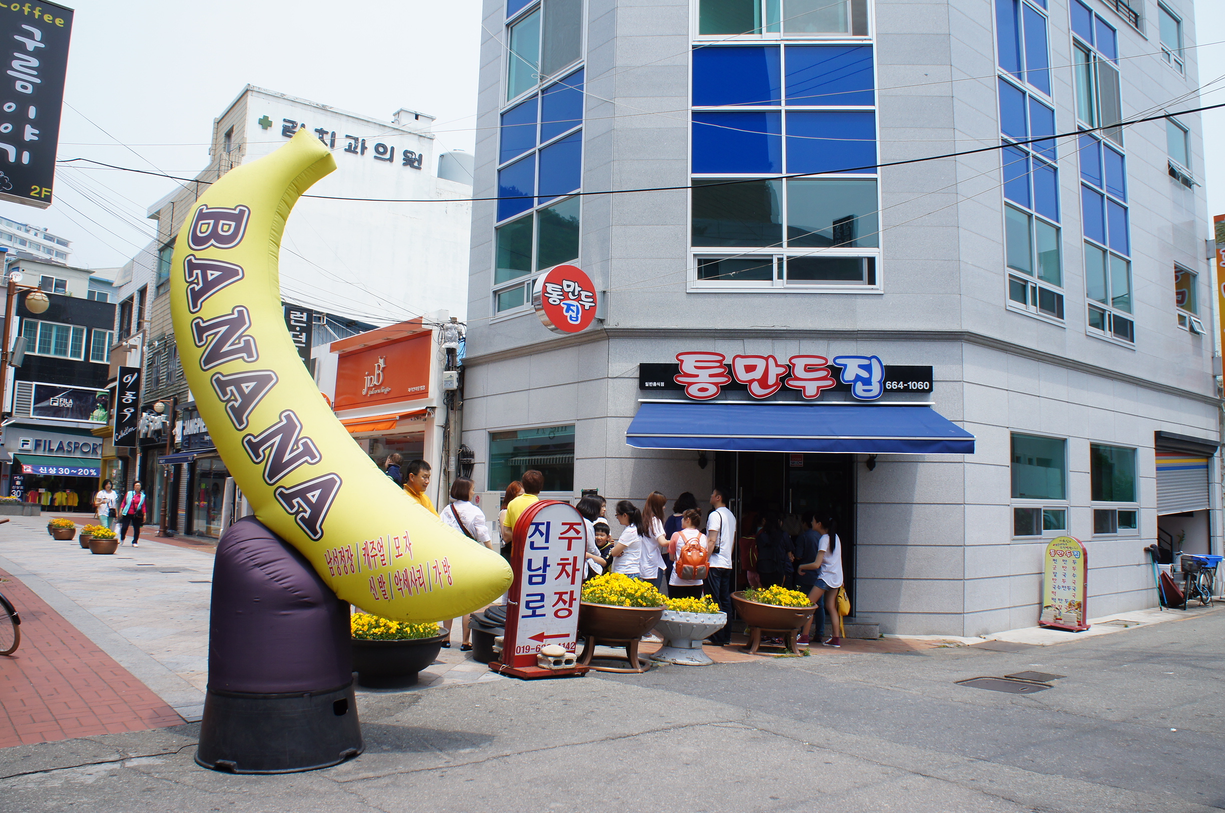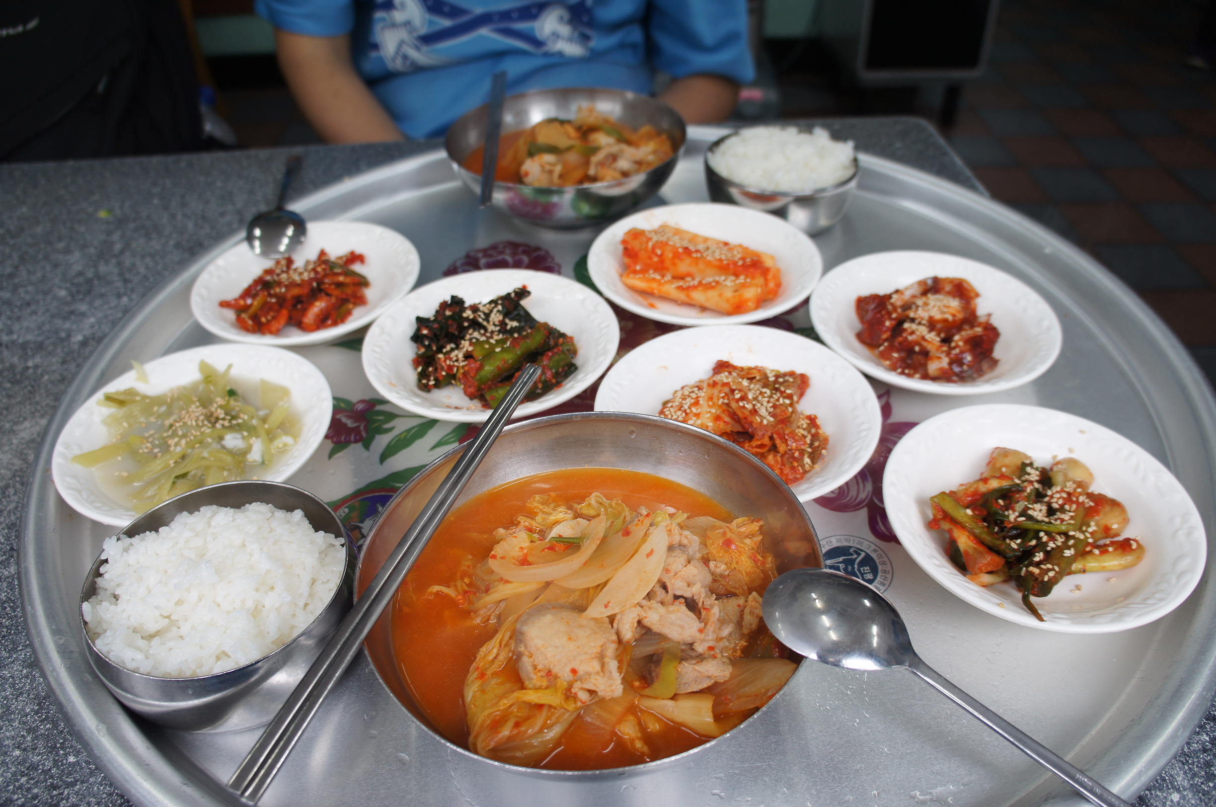 真係肚子餓了,好想快速咁搵到嘢食…沿住鎮南館對出條馬路行落斜路,好快就見到一堆充滿商鋪o既街道,但好似好多都係賣衫o既~雖然見到我上次去首爾時愛上咗o既Le Bunny Bleu鞋店,但入去一趟唔敢買嘢,冇理由拎住對鞋行多大半日o架,同埋我哋o既主要任務係要食午飯嘛~ SONY DSC 忽然間見到一條人龍,咦,好似係食肆喎,咁多人o既?窗口太細,望唔到係食咩o既,又冇menu係門口,我哋聽到人龍傳來普通話,就膽粗粗走去問下,原來係食餃子o既,不過咁長龍我哋唔等lu~ SONY DSC   行到呢度要叉一叉開話題,話說我哋後來行超級市場,發現廣告人氣最旺o既,男o既係鐘基(我哋係Running Man、成均館緋聞對佢好熟悉了),女o既就係金妍兒(有睇過「金妍兒的kiss and cry」嗎?),不論貨品o既種類,糧油雜貨,乜都關佢哋事﹗﹗     SONY DSC   點解搵餐廳o既途中又先搵到景點o架~李舜臣將軍o既廣場~ SONY DSC   當然唔少得關於佢o既介紹,柤機o既後面仲有好大個area都係講佢o既事跡~  SONY DSC   好在過條碼路就見到充滿食肆o既街道,我哋好快就揀定一間入去食了,點解揀佢?因為… SONY DSC 有中文餐牌呀﹗勁~ 餐廳個老伯(老闆乎?)好醒且搵拎咗個烏蠅拍出嚟,俾我哋指住嚟點菜,day好準確咁指住咗黃花魚湯o既中文,但唔醒o既係… SONY DSC 點解上菜時變咗泡菜湯o既?你睇番個餐牌就明白了…:p黃花魚湯o既中文同泡菜湯o既韓文,距離上只有1cm…umum…不過都好o既,如果唔叫錯,我哋又未必會叫泡菜湯,怕辣嘛~點知又唔辣喎,而且豬肉好腍好香濃,好好食~其他o既泡菜都好豐盛,雖然今次冇咁多海產,但都試咗好多新口味泡菜~滿足~